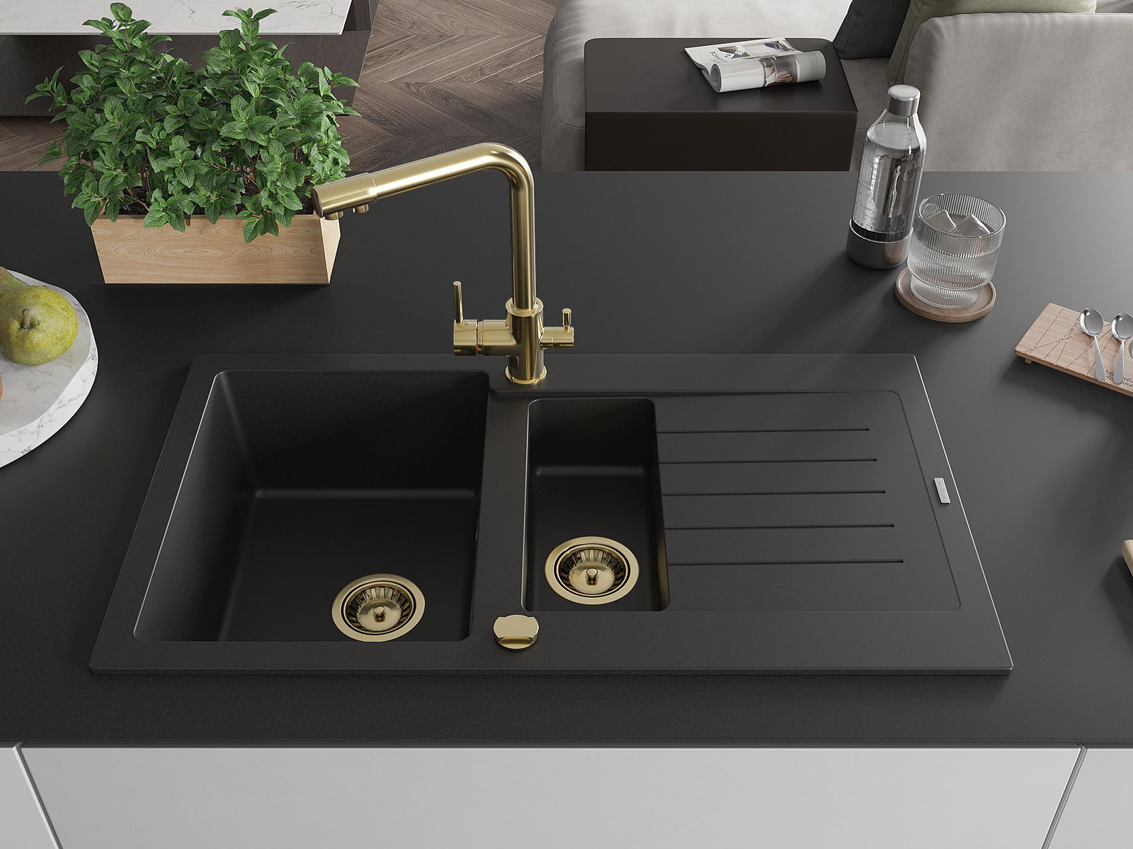Dřez má 2 předvrtané otvory o průměru 35 mm, které lze samostatně vyrazit. Mohou být použity mimo jiné k montáži dávkovače tekutin, který eliminuje přítomnost plastových lahví v kuchyni a dodá jí elegantní vzhled.