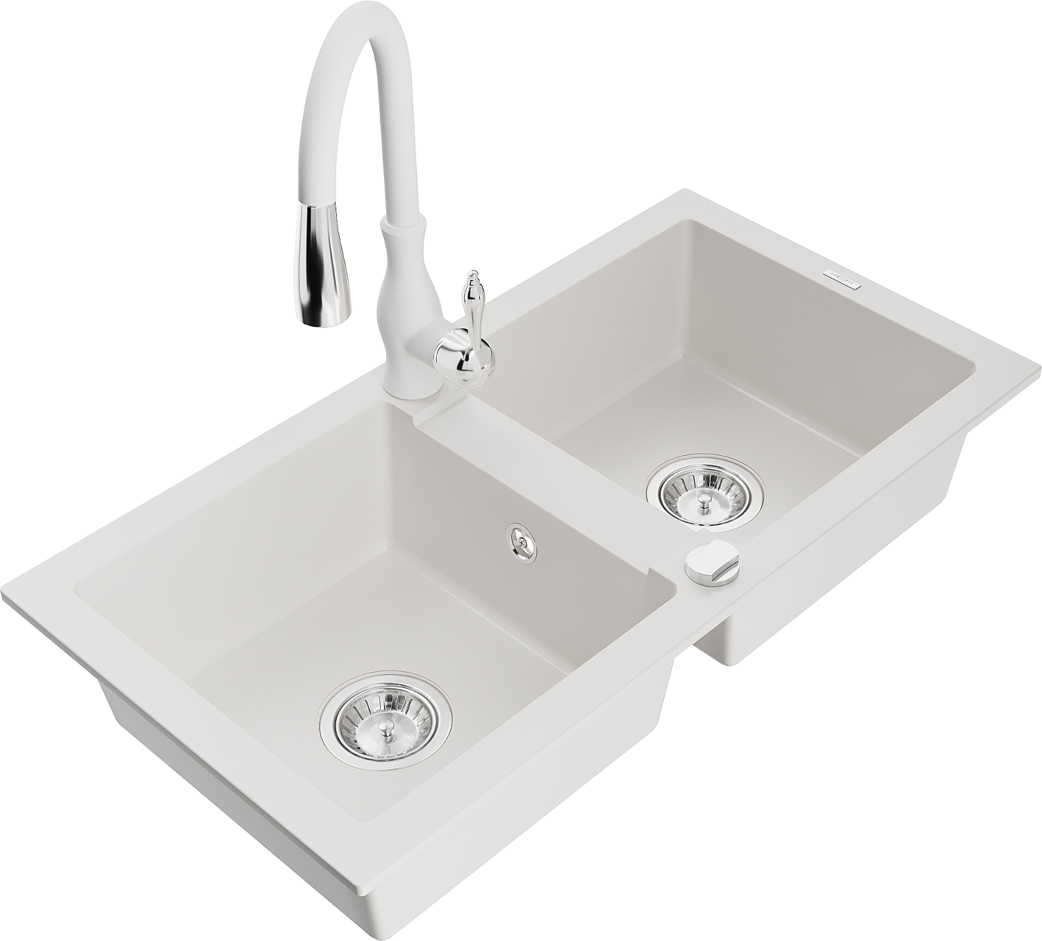 Mexen Mario žulový dřez s 2 komorami a kuchyňskou baterií Savita, bílý - 6504-20-672601-20