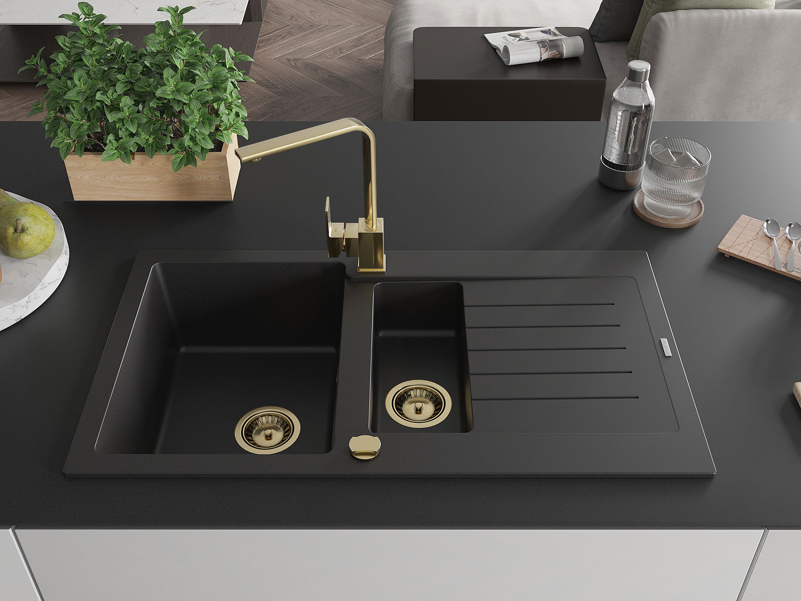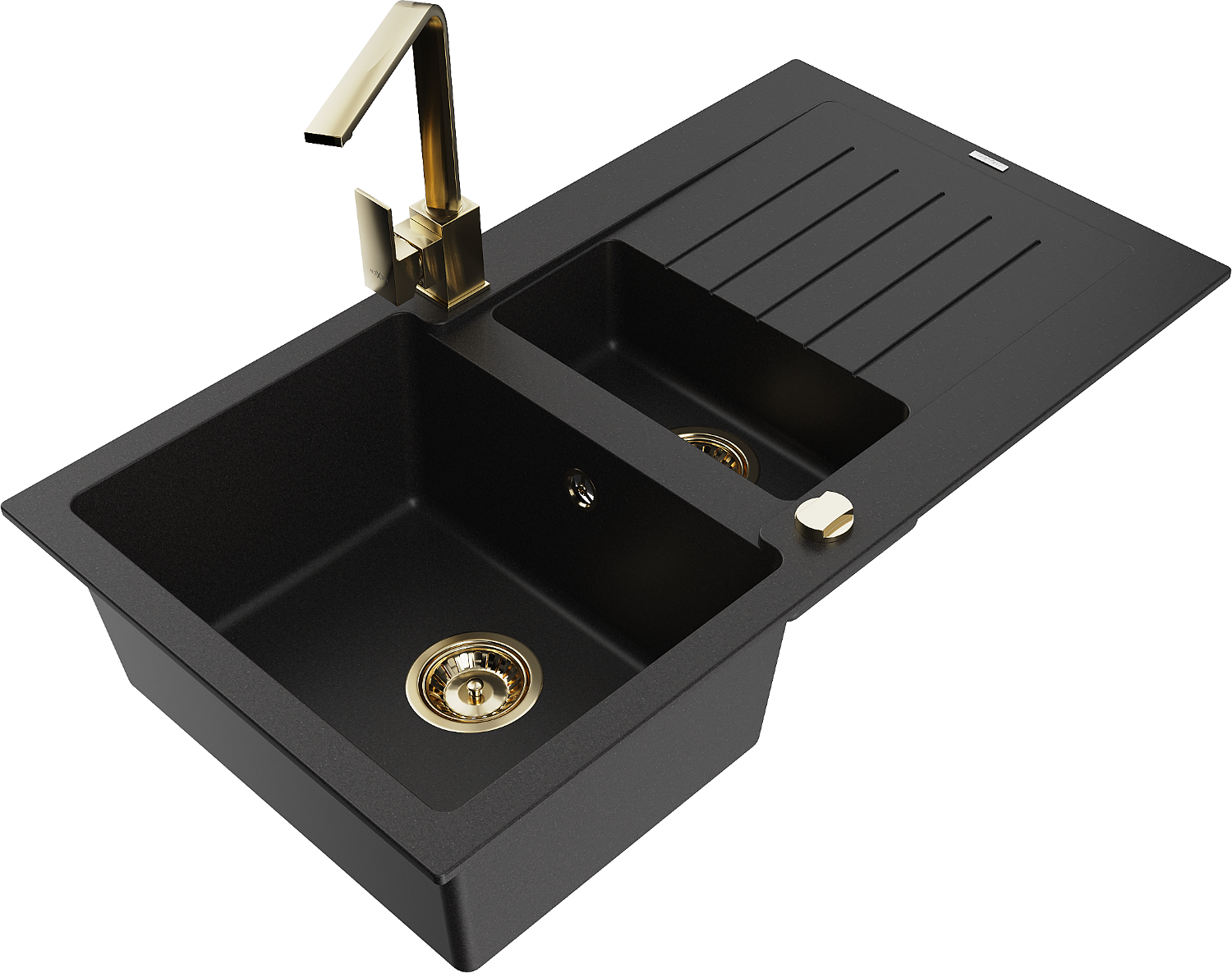 Mexen Matias žulový dřez 1,5-komorový s odkapávačem a kuchyňskou baterií Rita, černý - 6502-77-670300-50