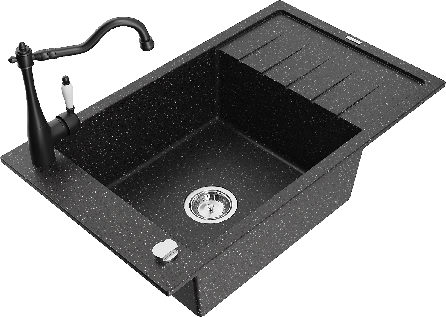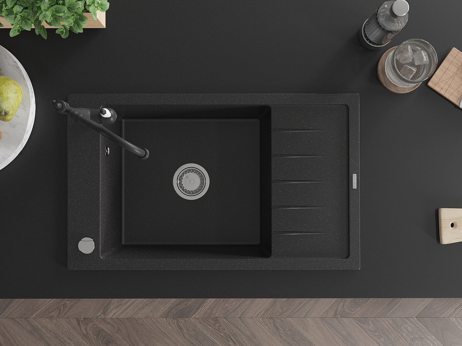 Mexen Elias granitový dřez 1-komorový s odkapávačem a kuchyňskou baterií Carla, černý/stříbrný metalik - 6511-73-670700-70