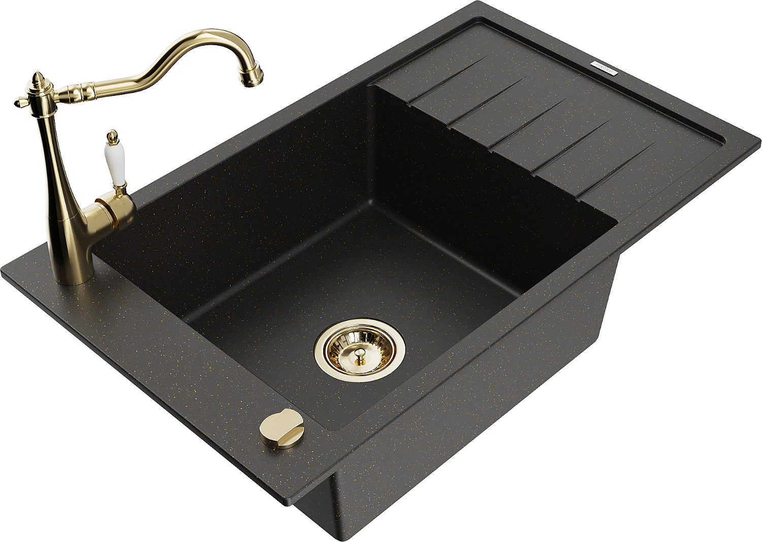 Mexen Elias granitový dřez 1-komorový s odkapávačem a kuchyňskou baterií Carla, černý/zlatý metalik - 6511-75-670700-50