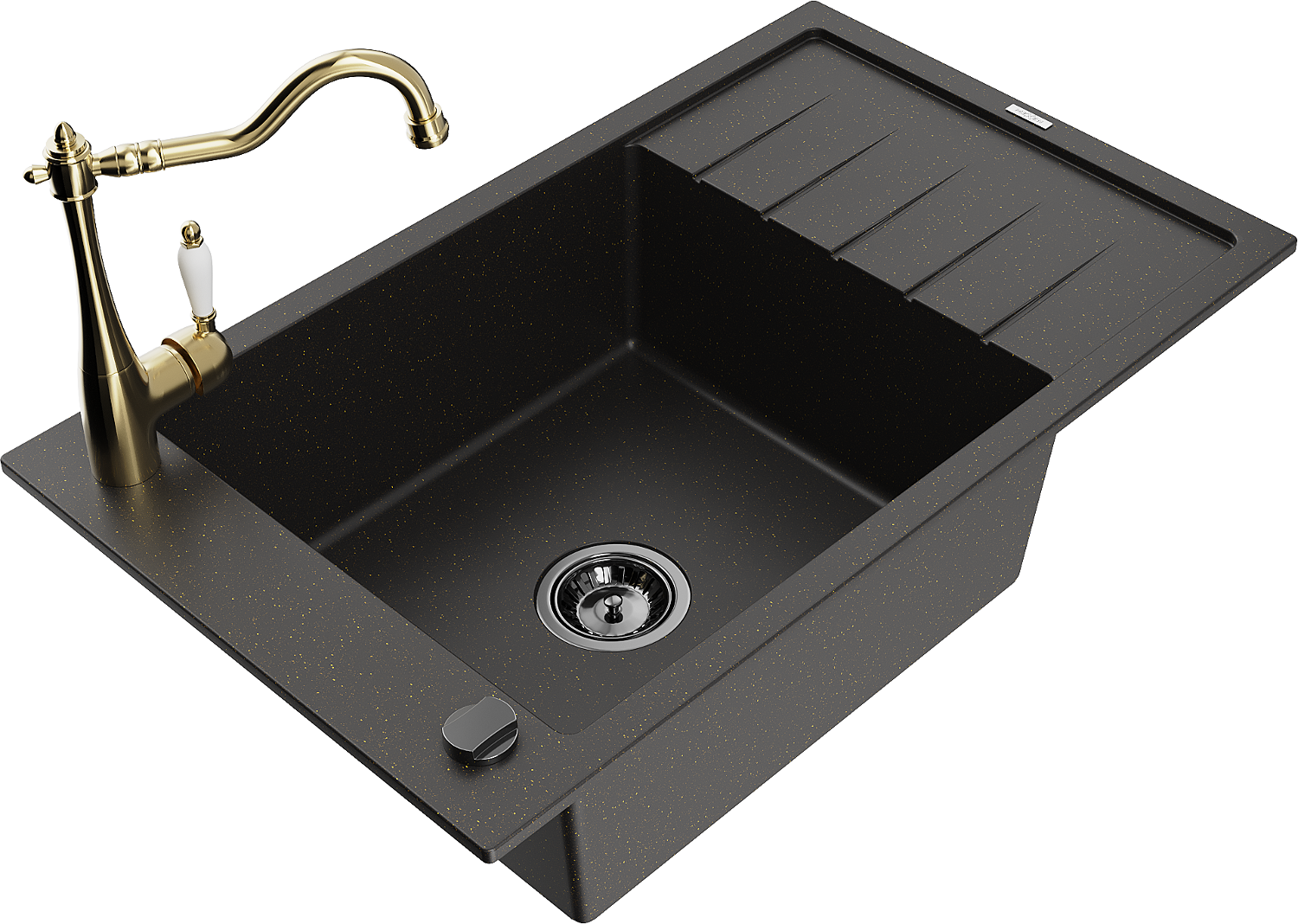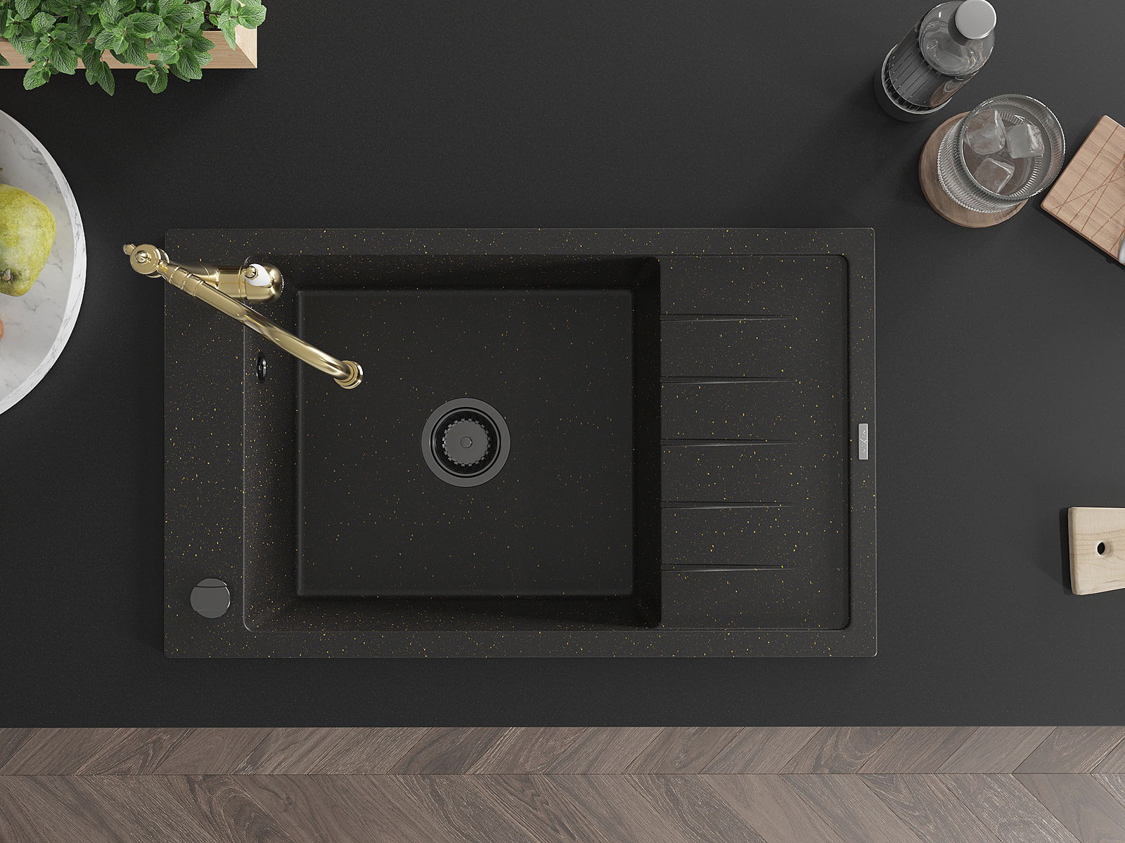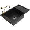 Mexen Elias dřez z granitu 1-komorový s odkapávačem a kuchyňskou baterií Carla, černý/zlatý metalik - 6511-75-670700-50-B