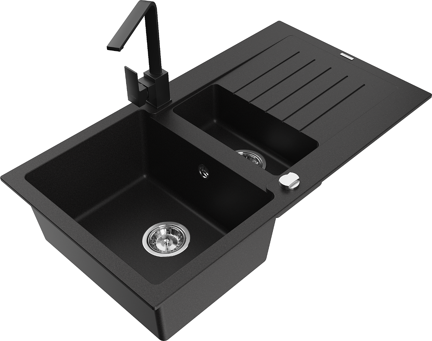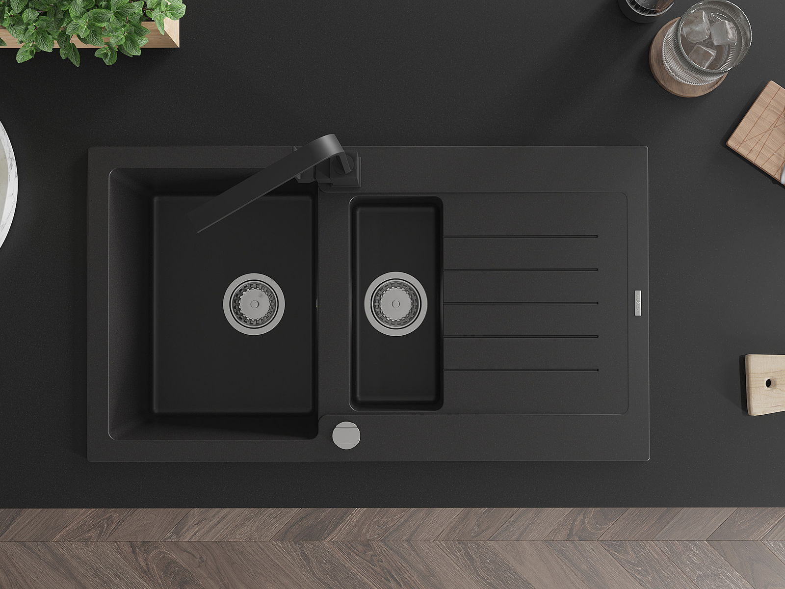 Mexen Matias granitový dřez 1,5-komorový s odkapávačem a kuchyňskou baterií Rita, černý - 6502-77-670300-70