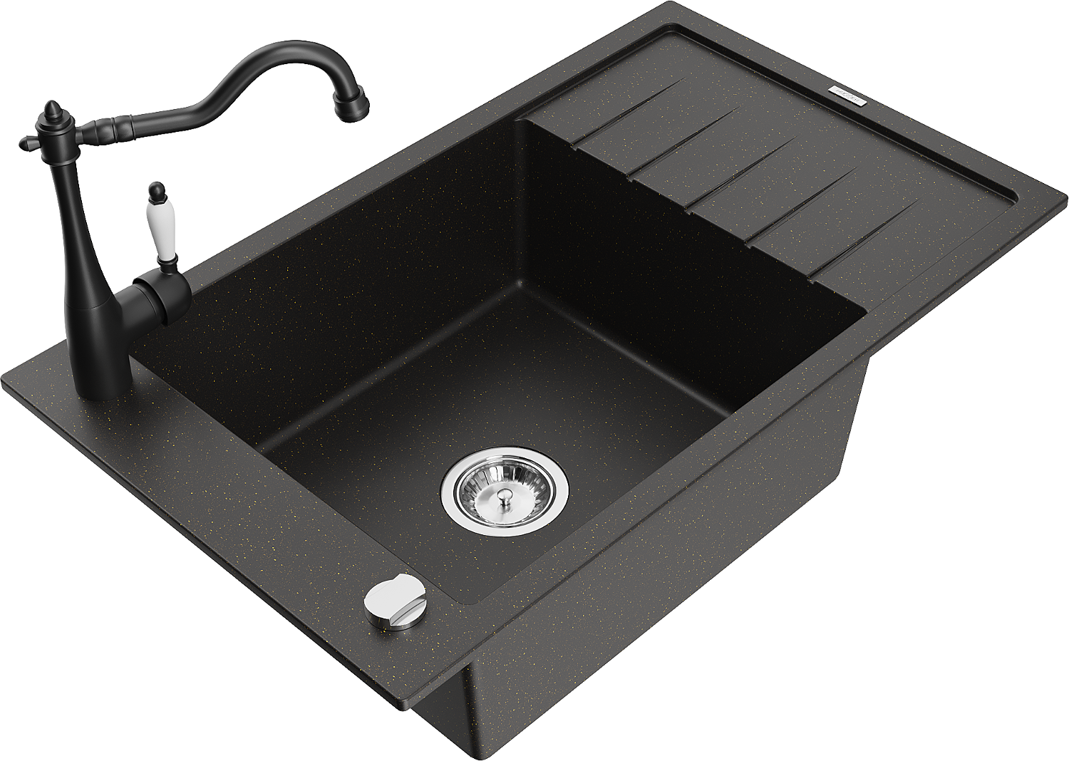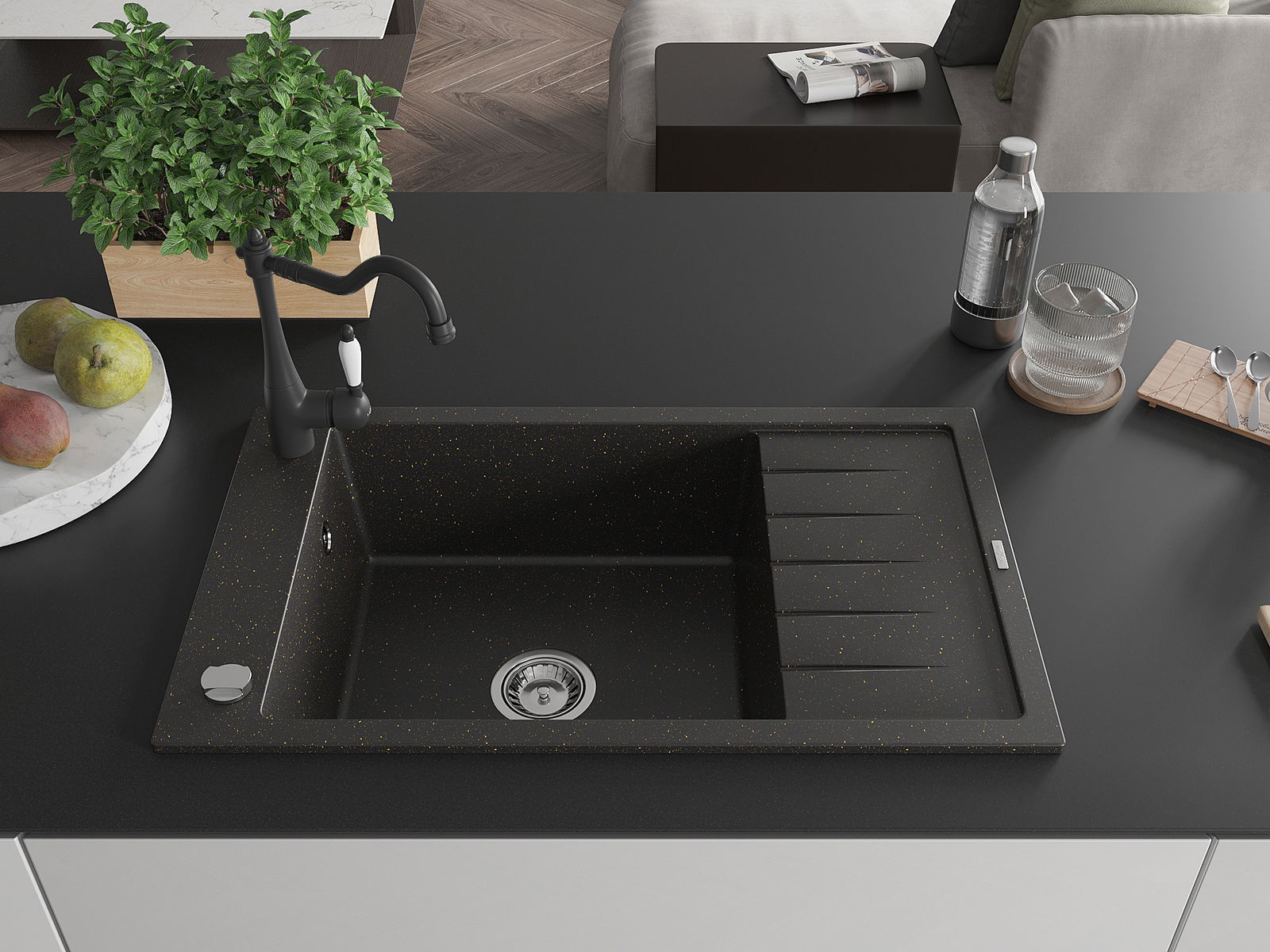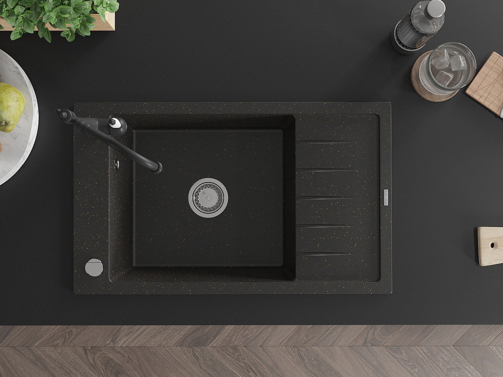Mexen Elias granitový dřez 1-komorový s odkapávačem a kuchyňskou baterií Carla, černý/zlatý metalik - 6511-75-670700-70