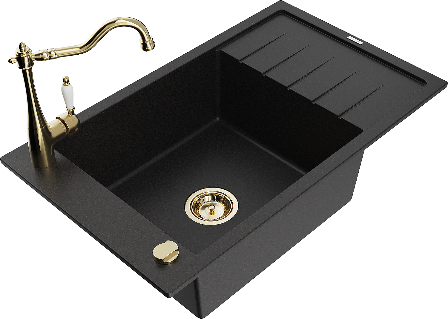 • Mexen Elias granitový kuchyňský dřez s 1 komorou a odkapávačem a kuchyňskou baterií Carla, černý - 6511-77-670700-50