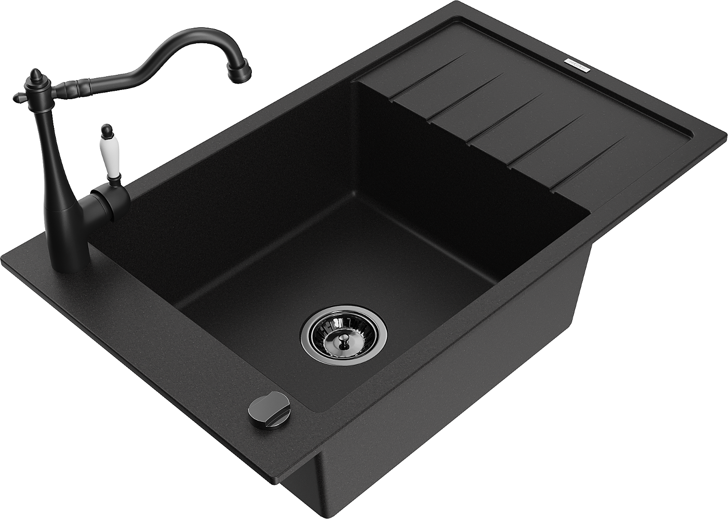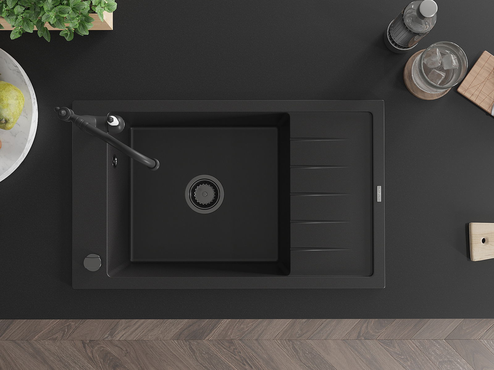 Mexen Elias jednovaničkový žulový dřez s odkapávačem a kuchyňskou baterií Carla, černý - 6511-77-670700-70-B