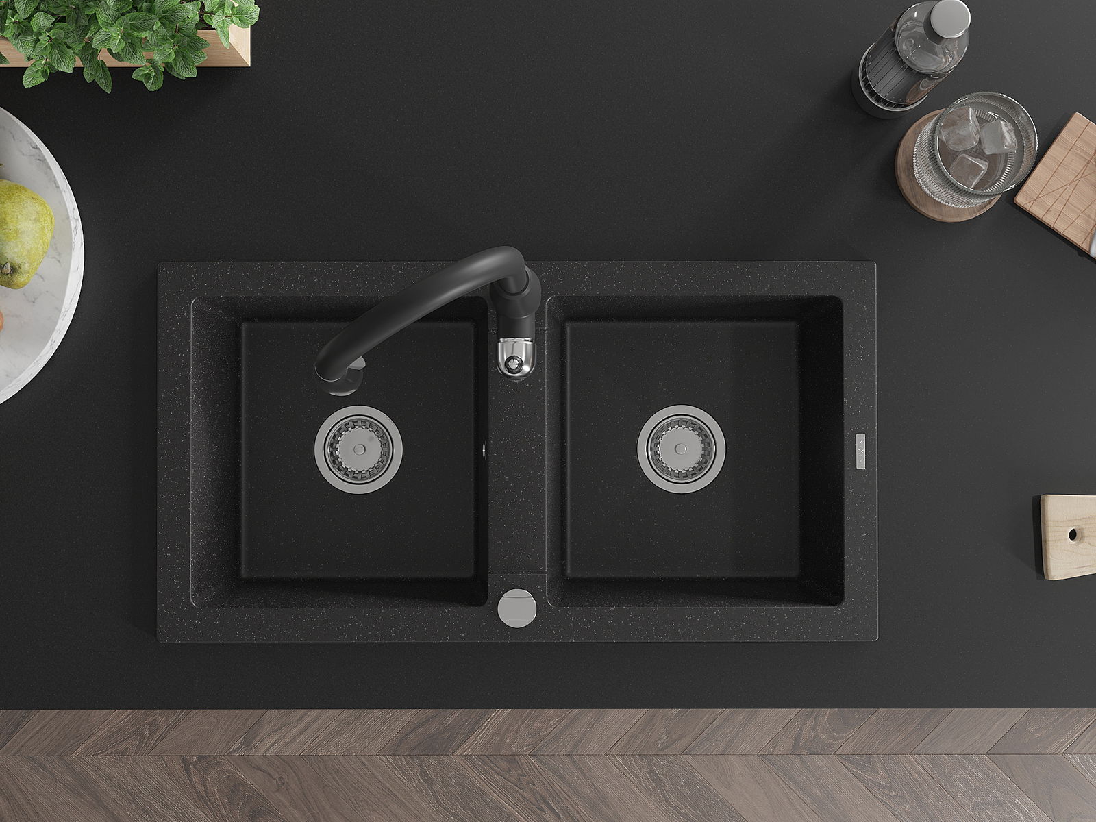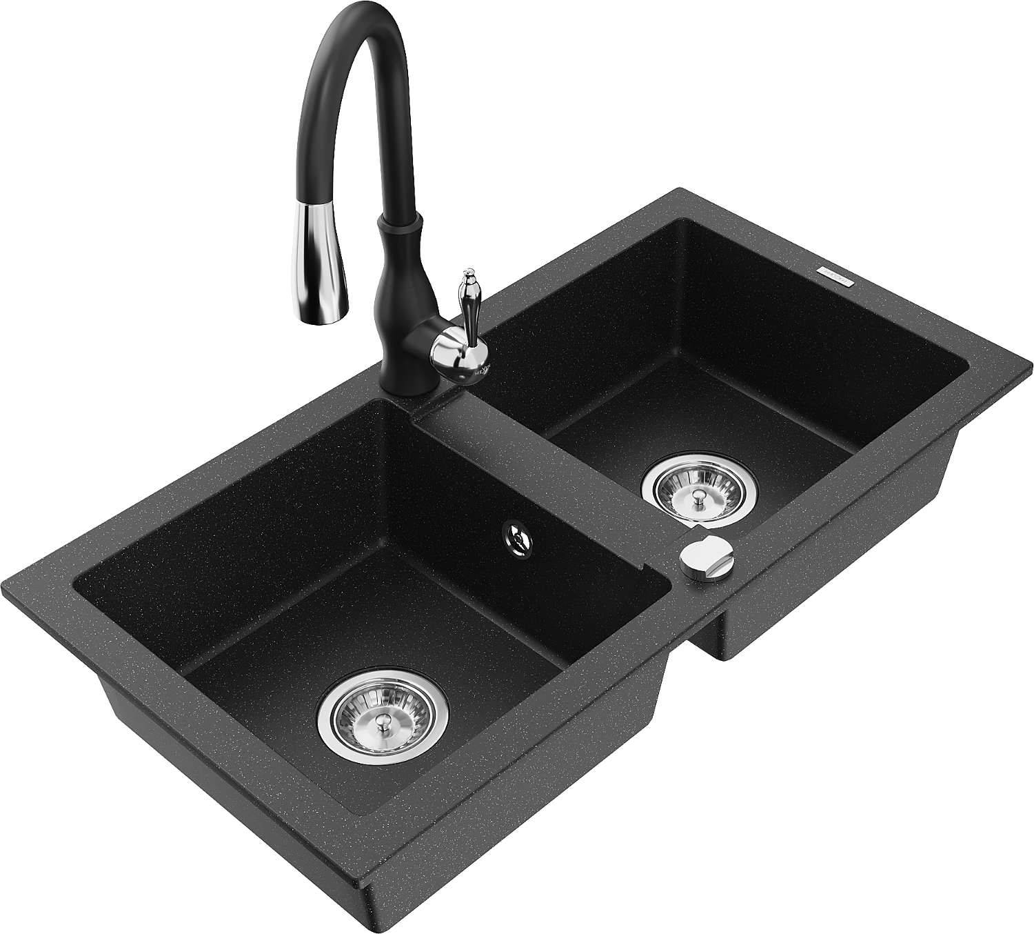 Mexen Mario žulový dřez s 2 komorami a kuchyňskou baterií Savita, černý/stříbrný metalický - 6504-73-672601-70