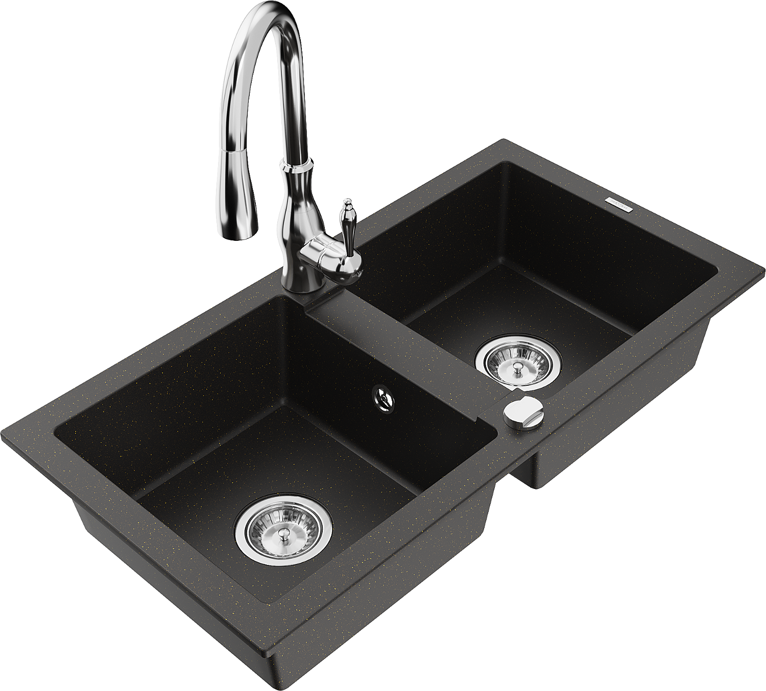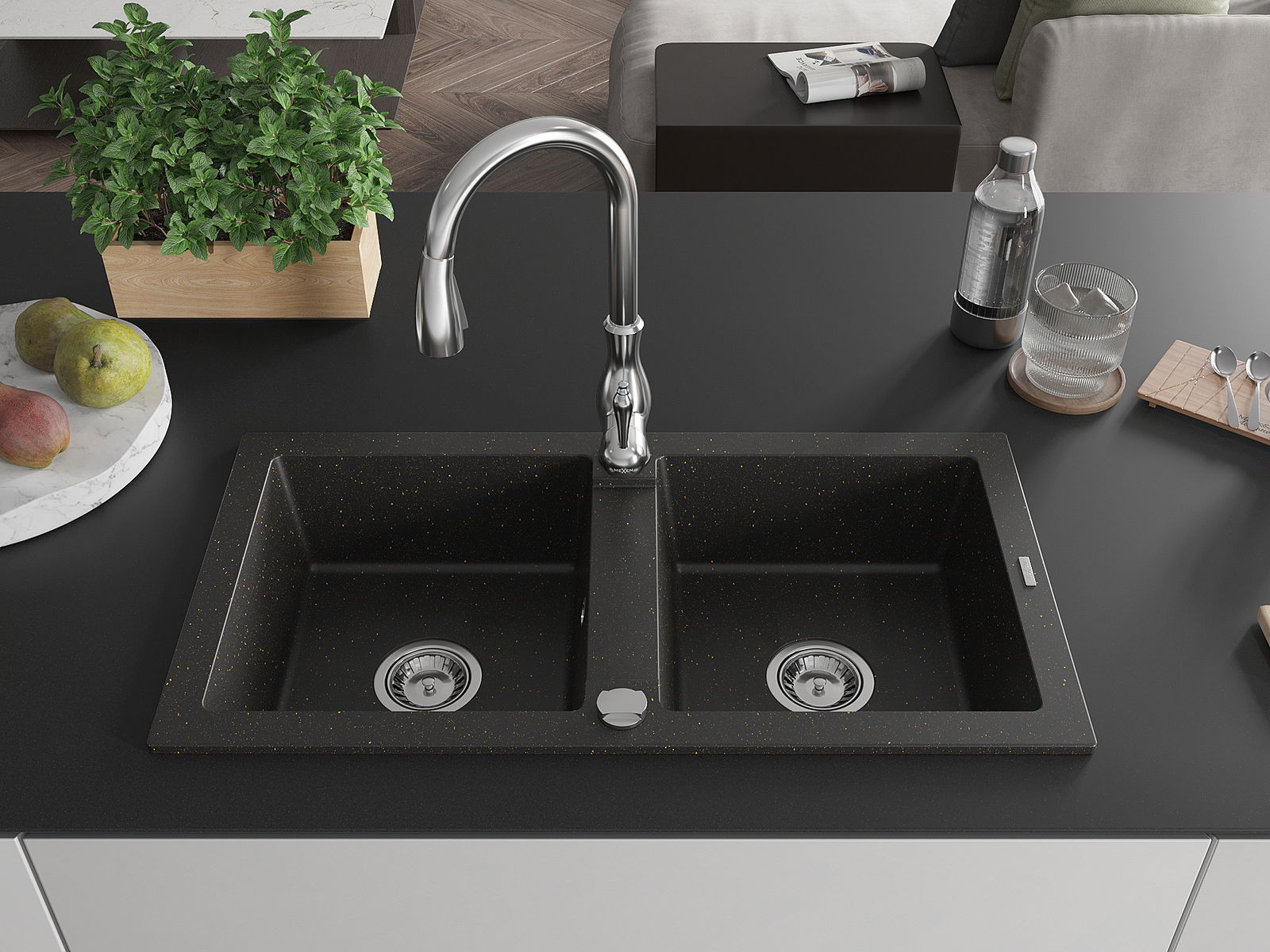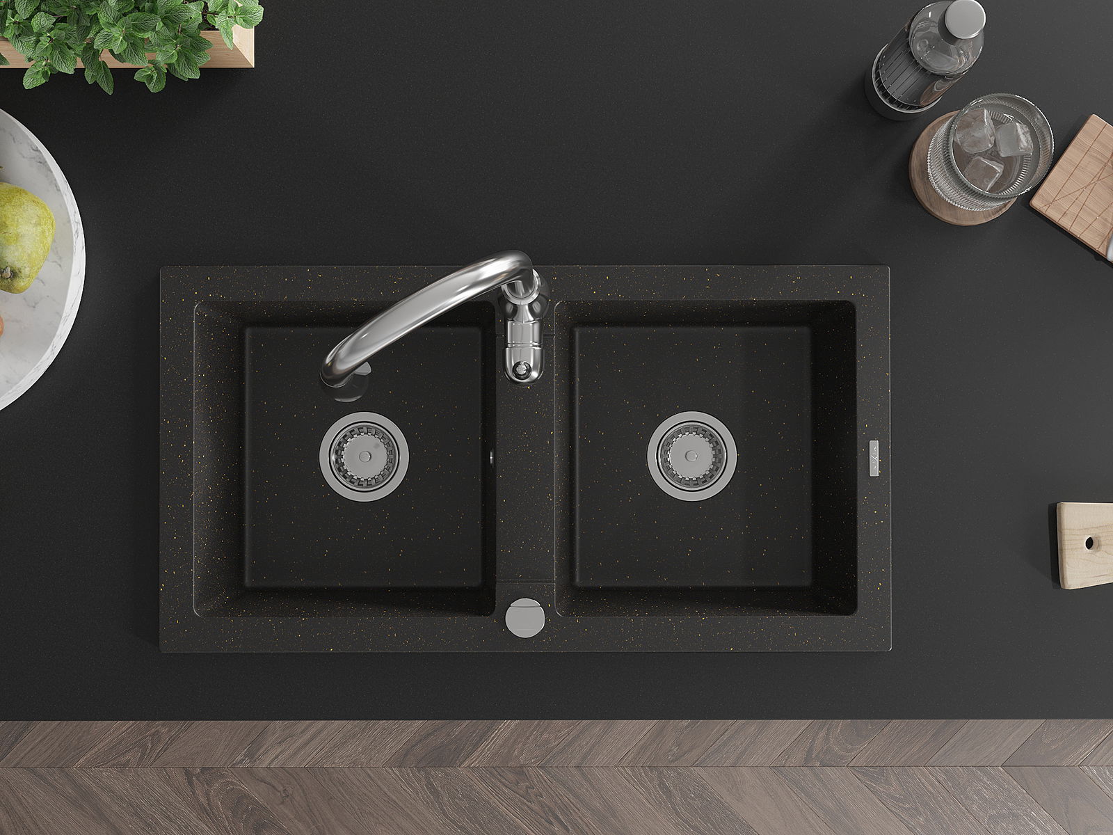 Mexen Mario žulový dřez, dvoukomorový s kuchyňskou baterií Savita, černý/zlatý metalický - 6504-75-672601-00