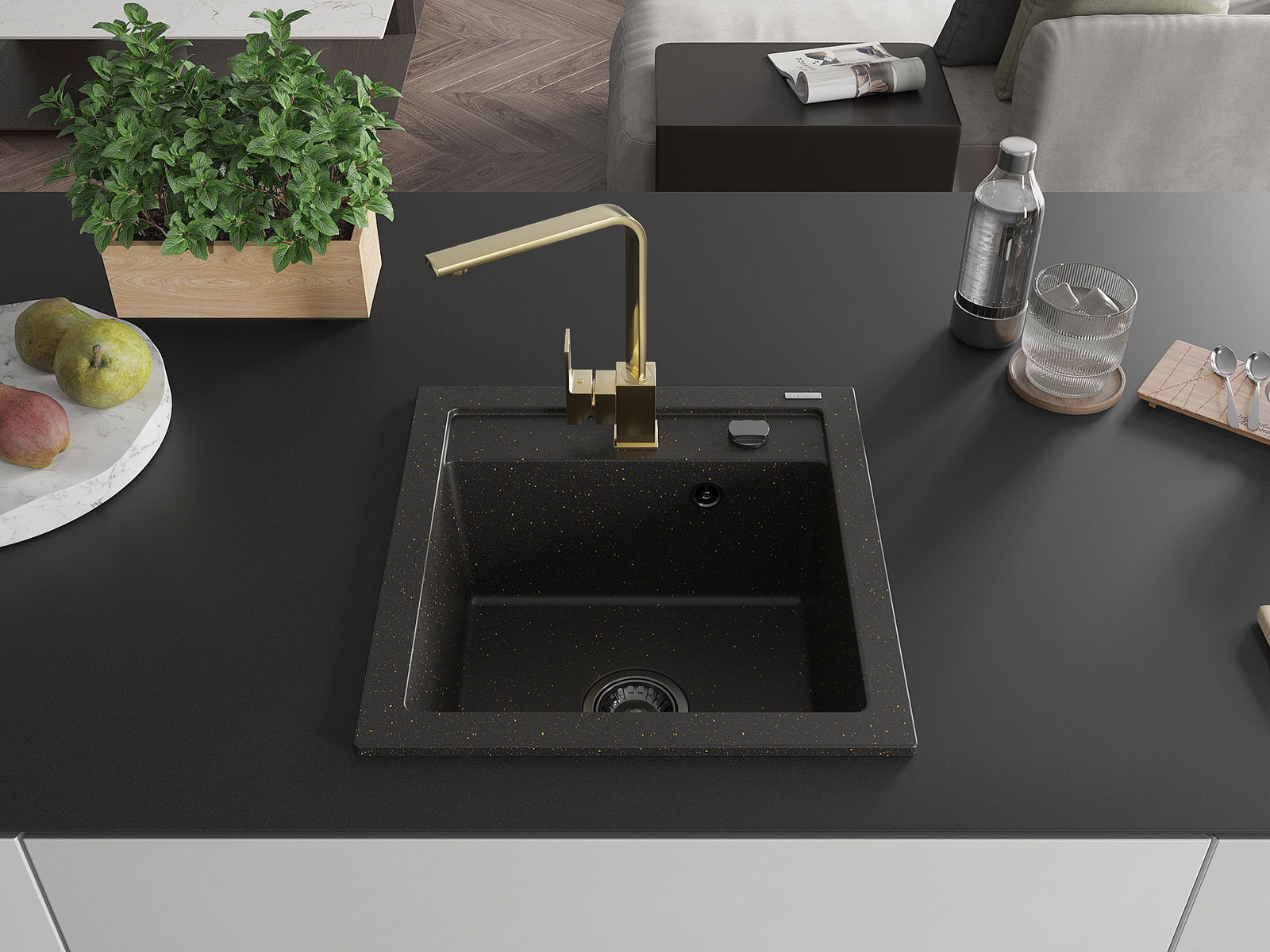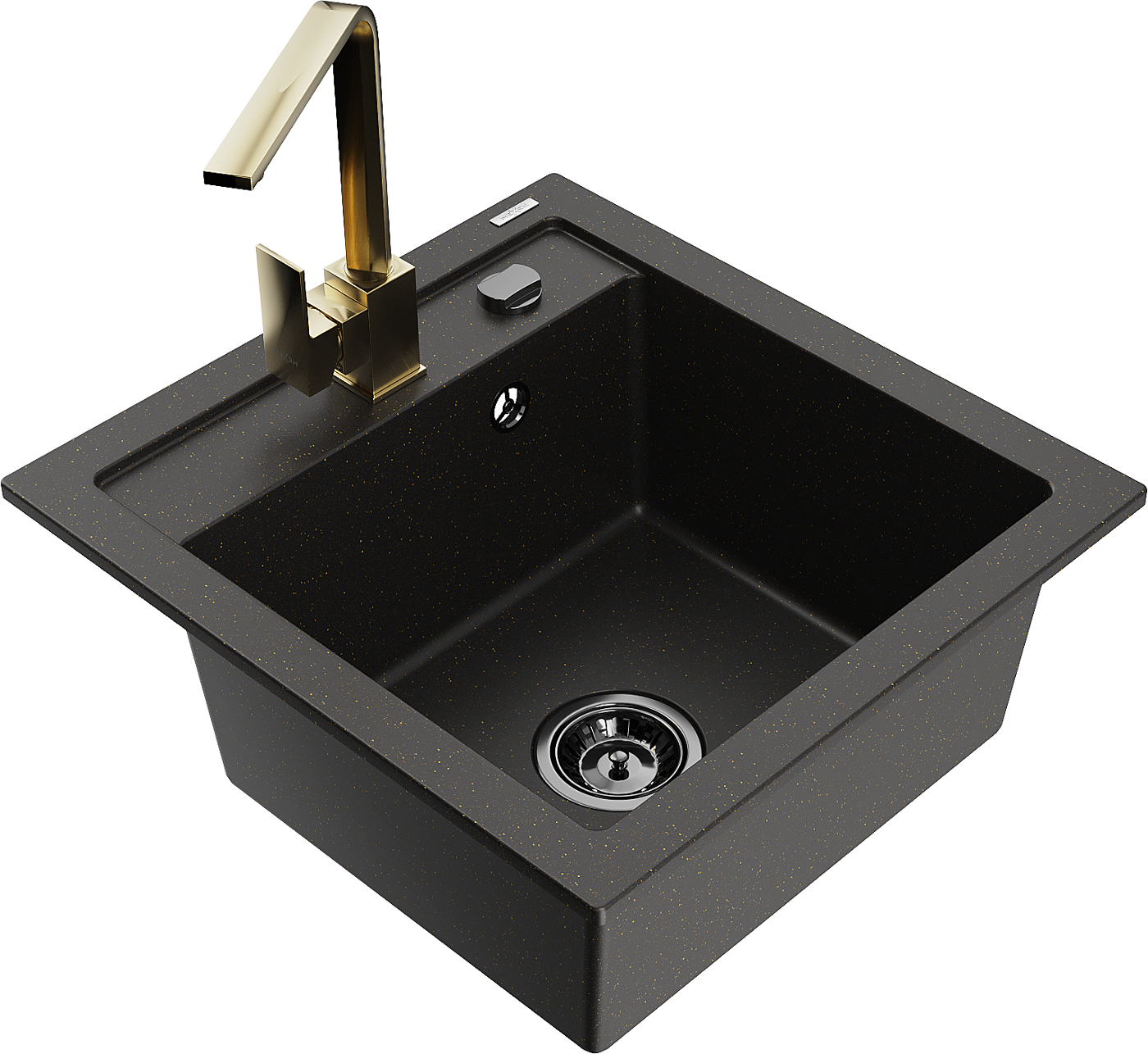 Mexen Vito granitový dřez 1-komorový s kuchyňskou baterií Rita, černý/zlatý metalik - 6503-75-670300-50-B