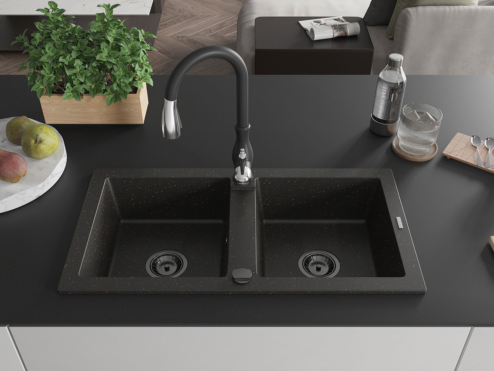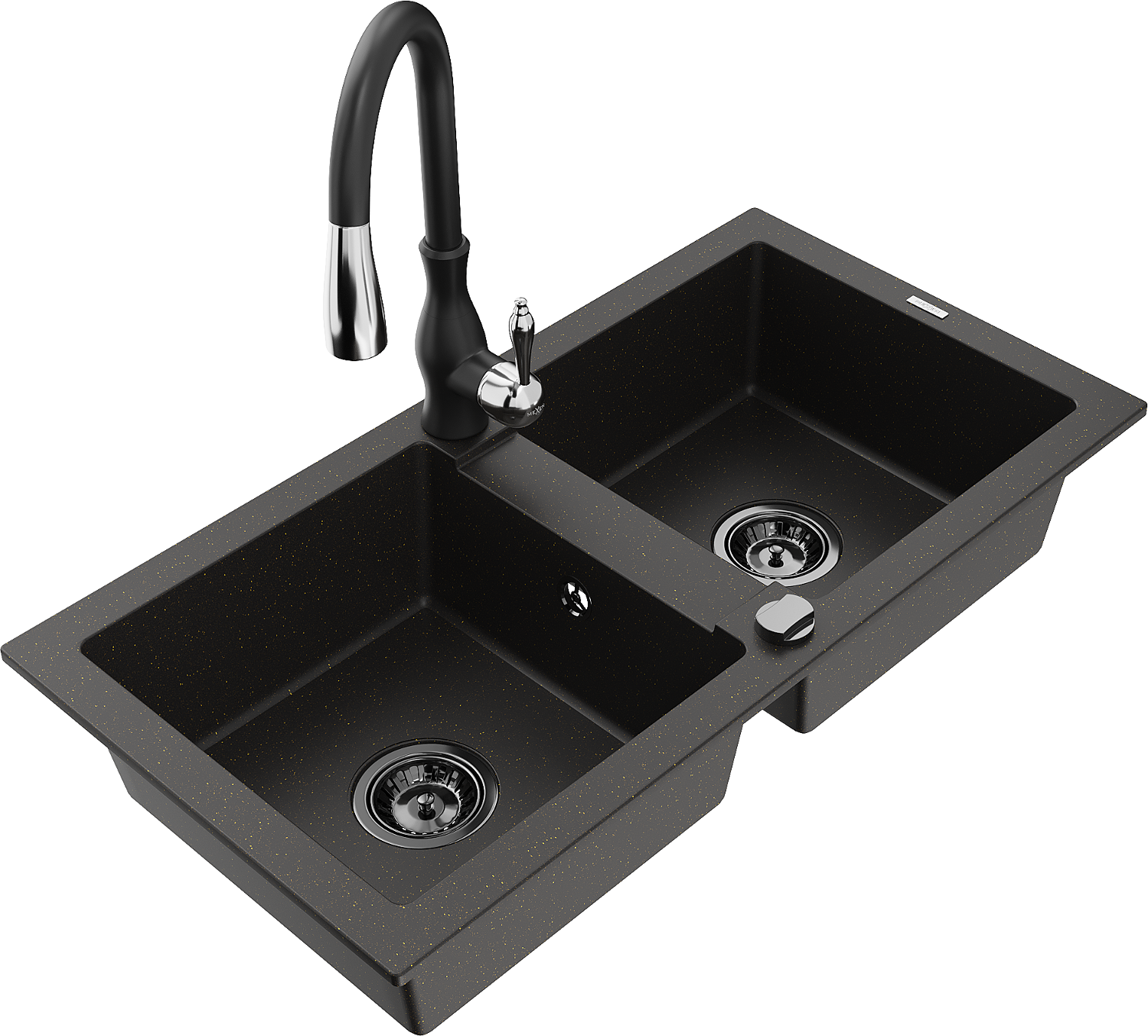 Mexen Mario žulový dřez 2-komorový s kuchyňskou baterií Savita, černý/zlatý metalický - 6504-75-672601-70-B