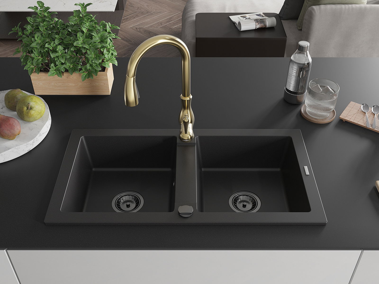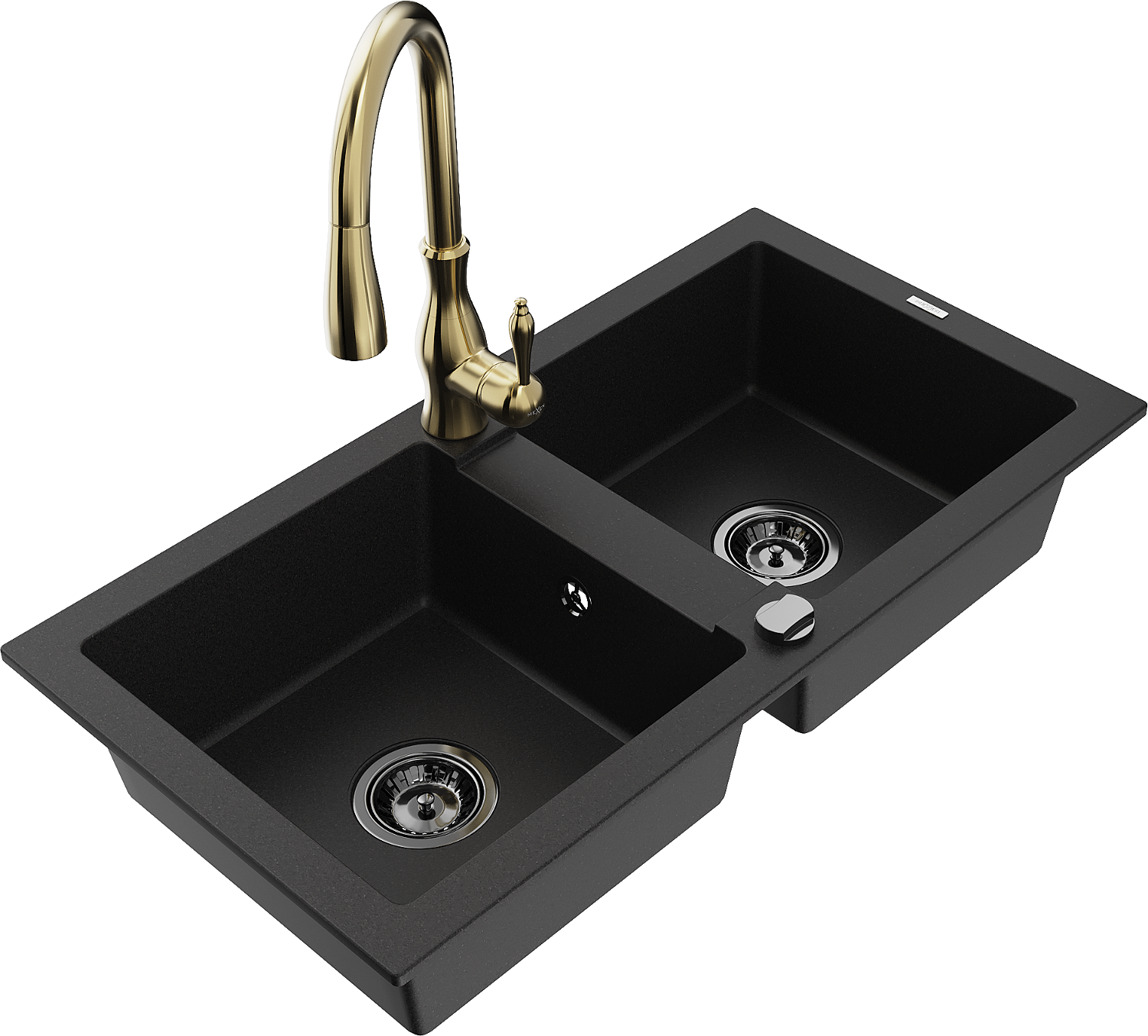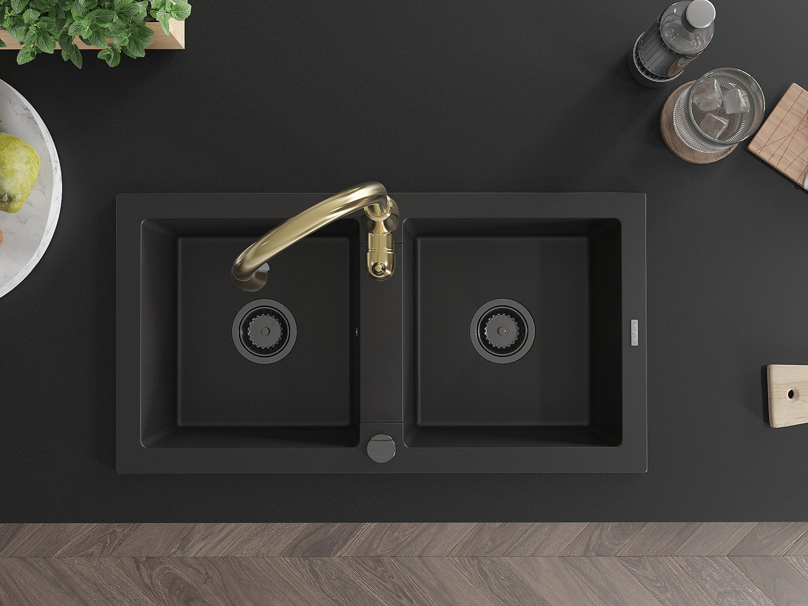 Mexen Mario granitový dřez dvoukomorový s kuchyňskou baterií Savita, černý - 6504-77-672601-50-B