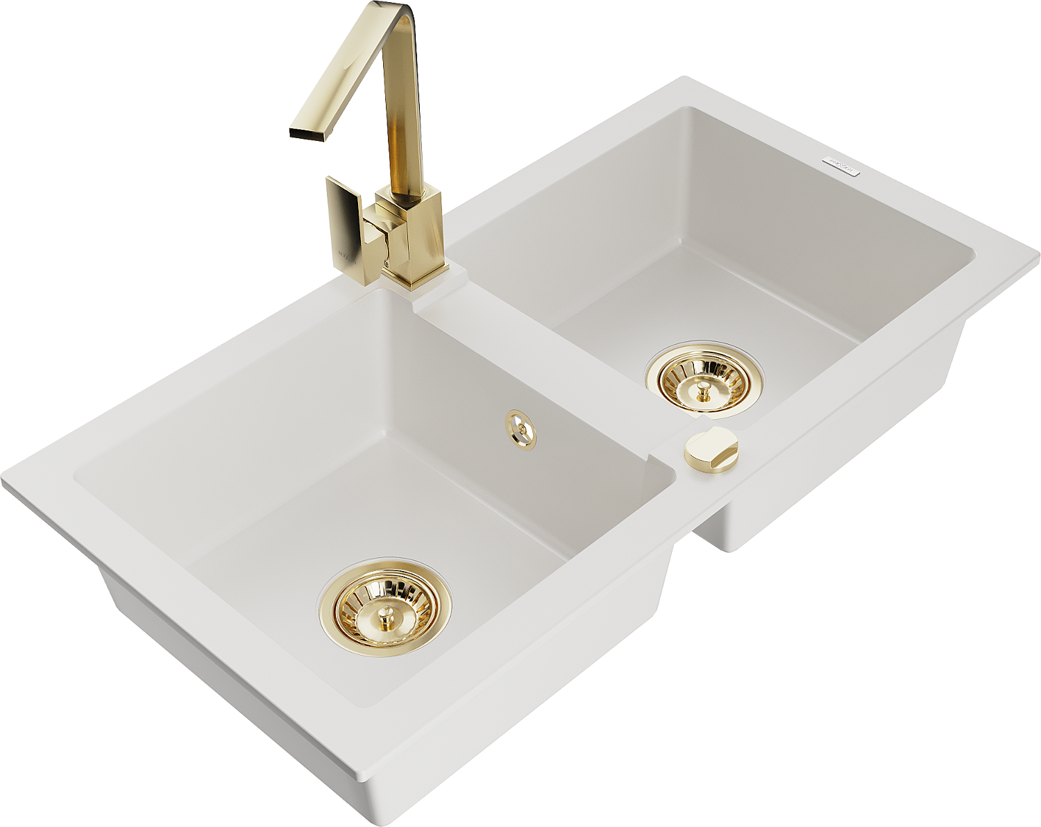 Mexen Mario dvoukomorový granitový dřez s kuchyňskou baterií Rita, bílý - 6504-20-670300-50