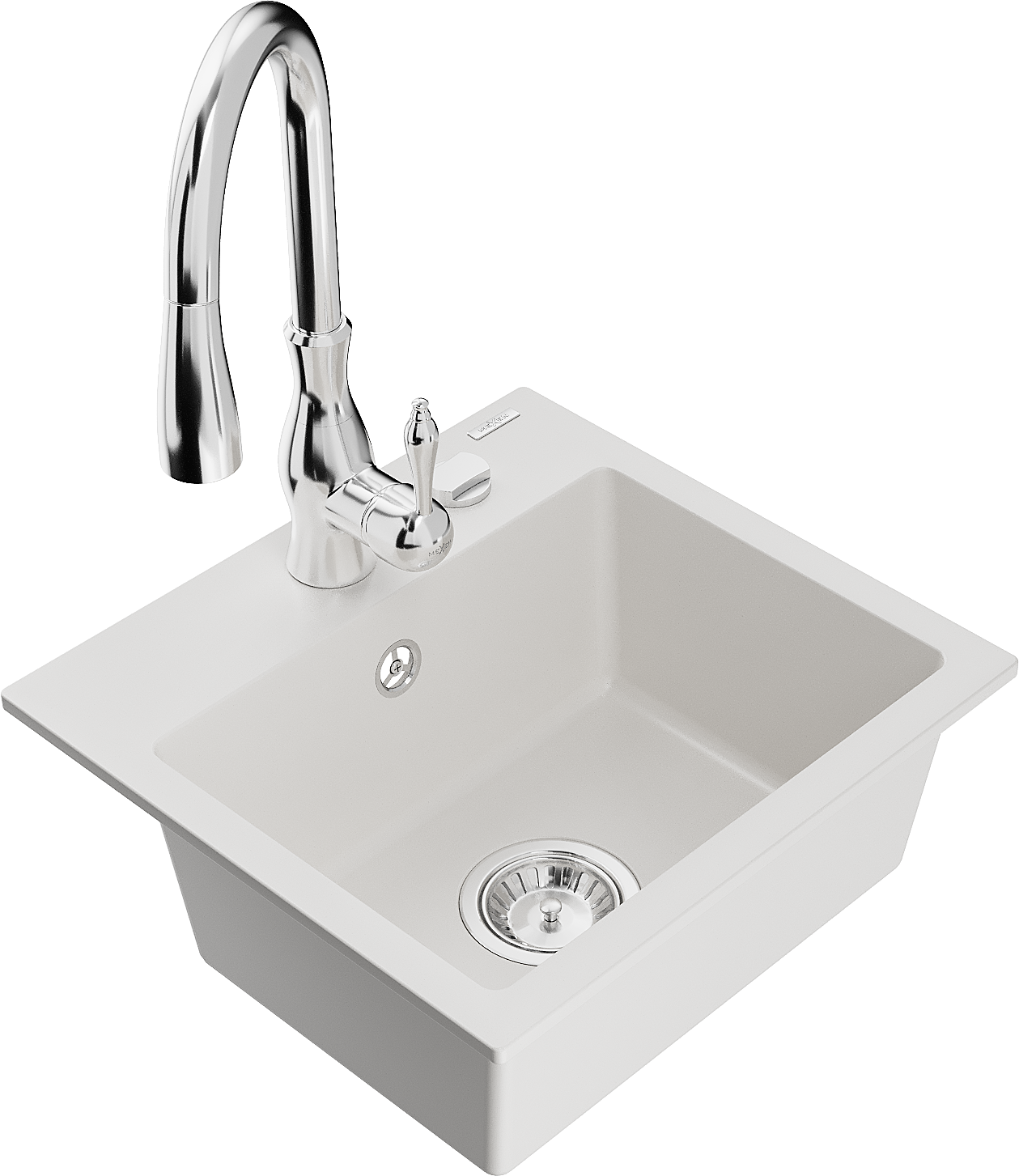 Mexen Milo granitový dřez 1-komorový s kuchyňskou baterií Savita, bílý - 6505-20-672601-00
