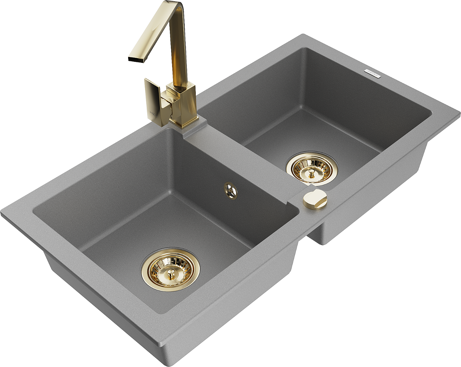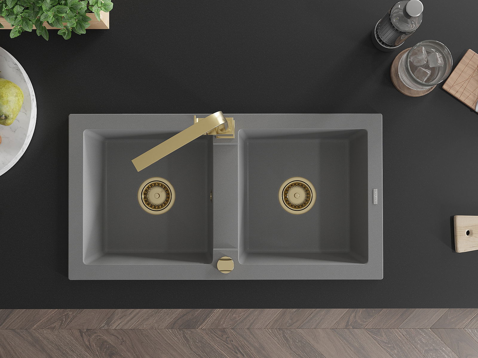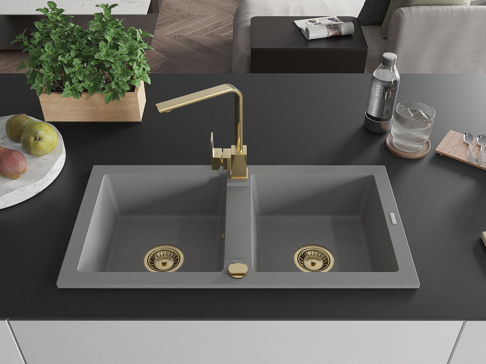Mexen Mario dřez granitový 2-komorový s kuchyňskou baterií Rita, šedý - 6504-71-670300-50