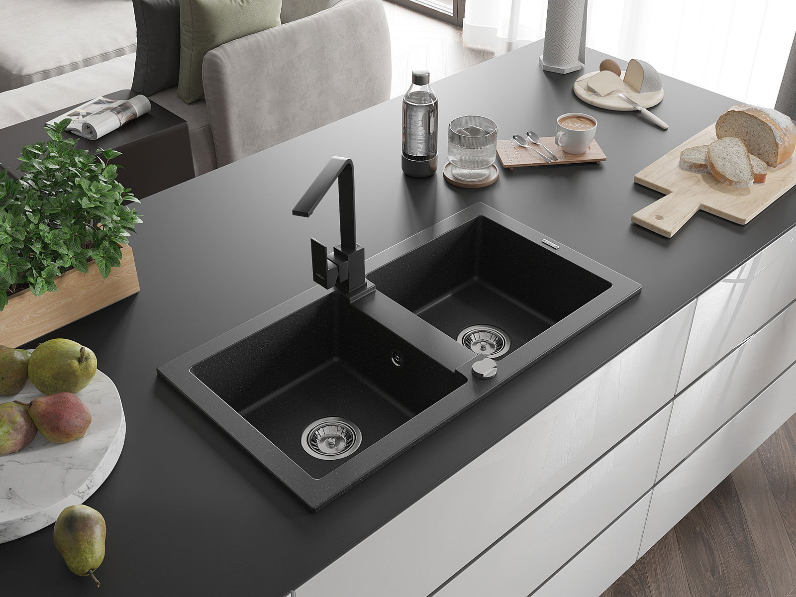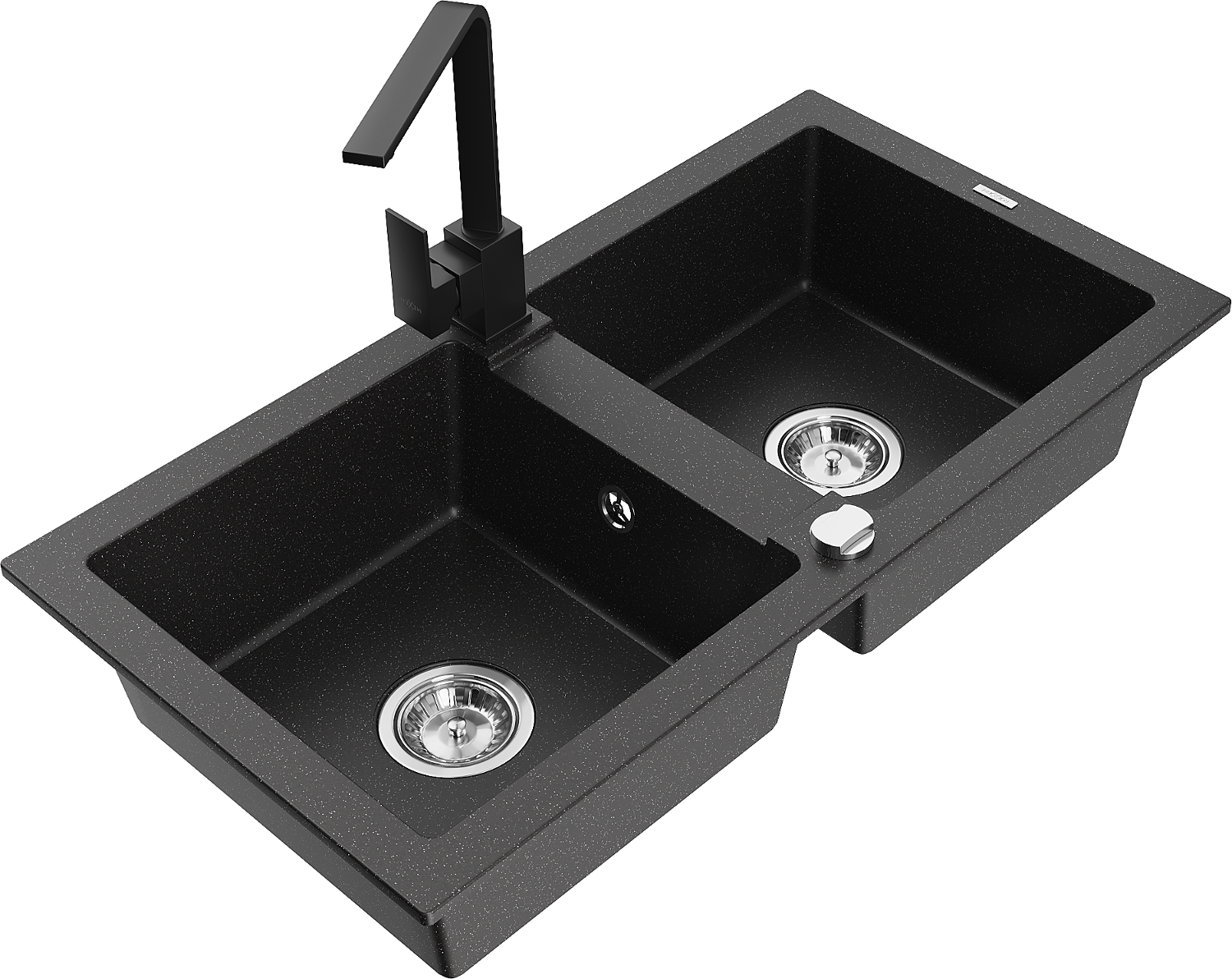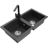 Mexen Mario kuchyňský dřez žulový 2-komorový s kuchyňskou baterií Rita, černý/stříbrný metalický - 6504-73-670300-70