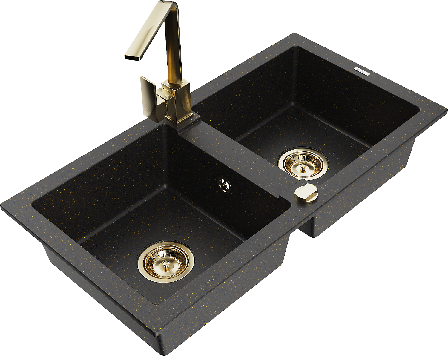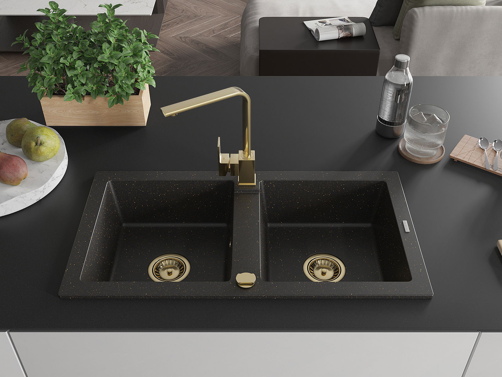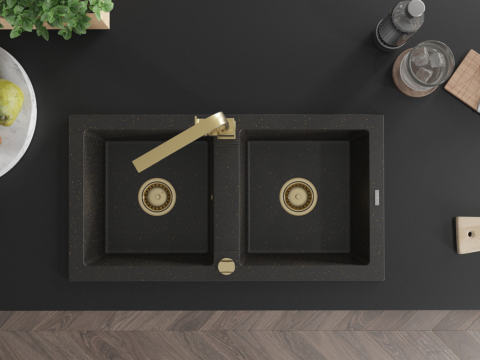 Mexen Mario dvojkomorový granitový dřez s kuchyňskou baterií Rita, černá/zlatý metalík - 6504-75-670300-50