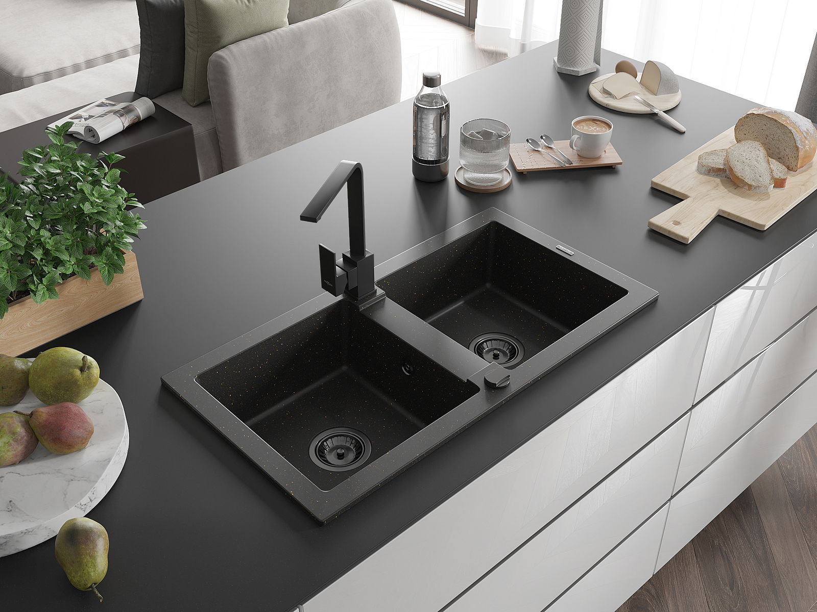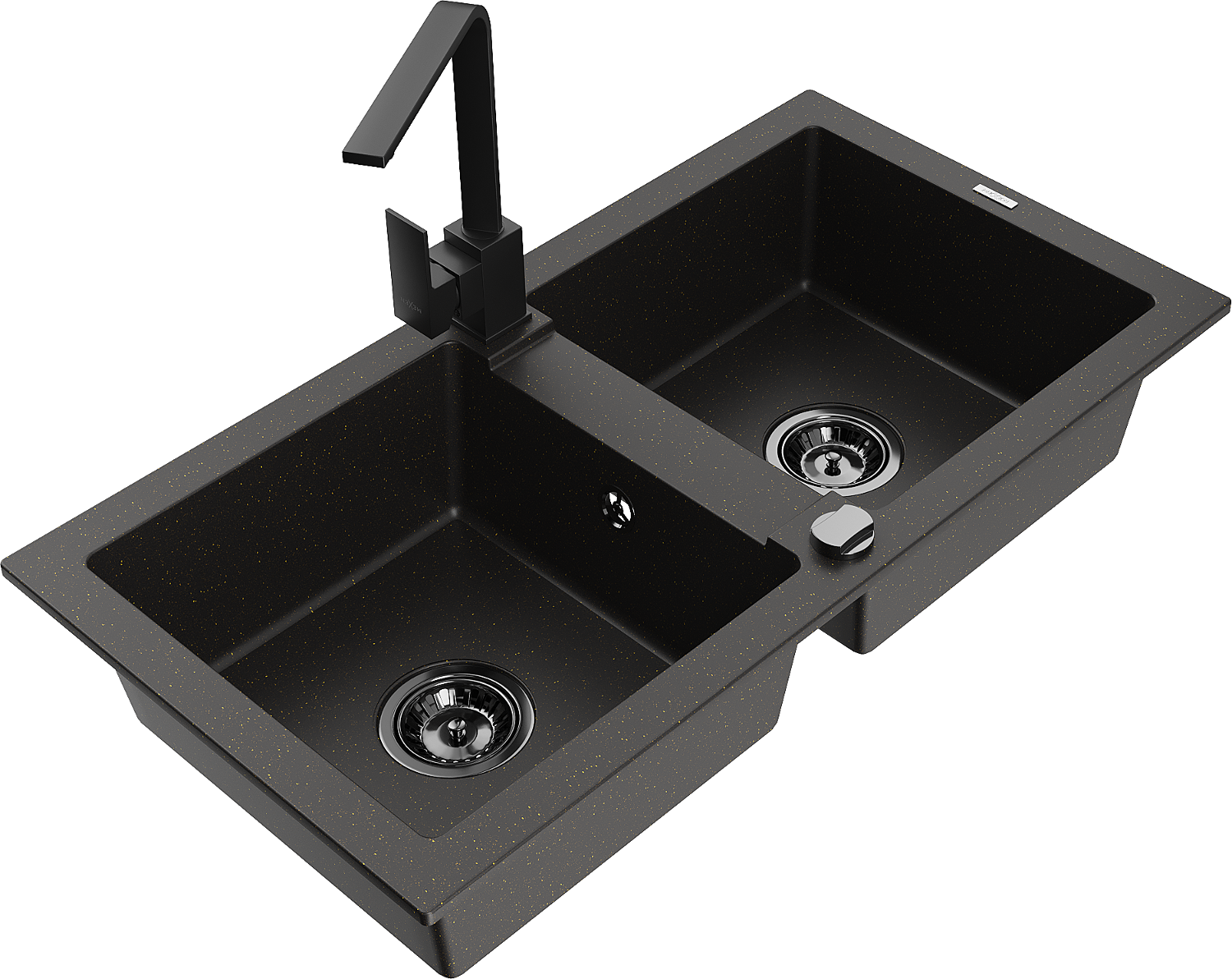 Mexen Mario žulový dřez 2-komorový s kuchyňskou baterií Rita, černý/zlatý metalik - 6504-75-670300-70-B