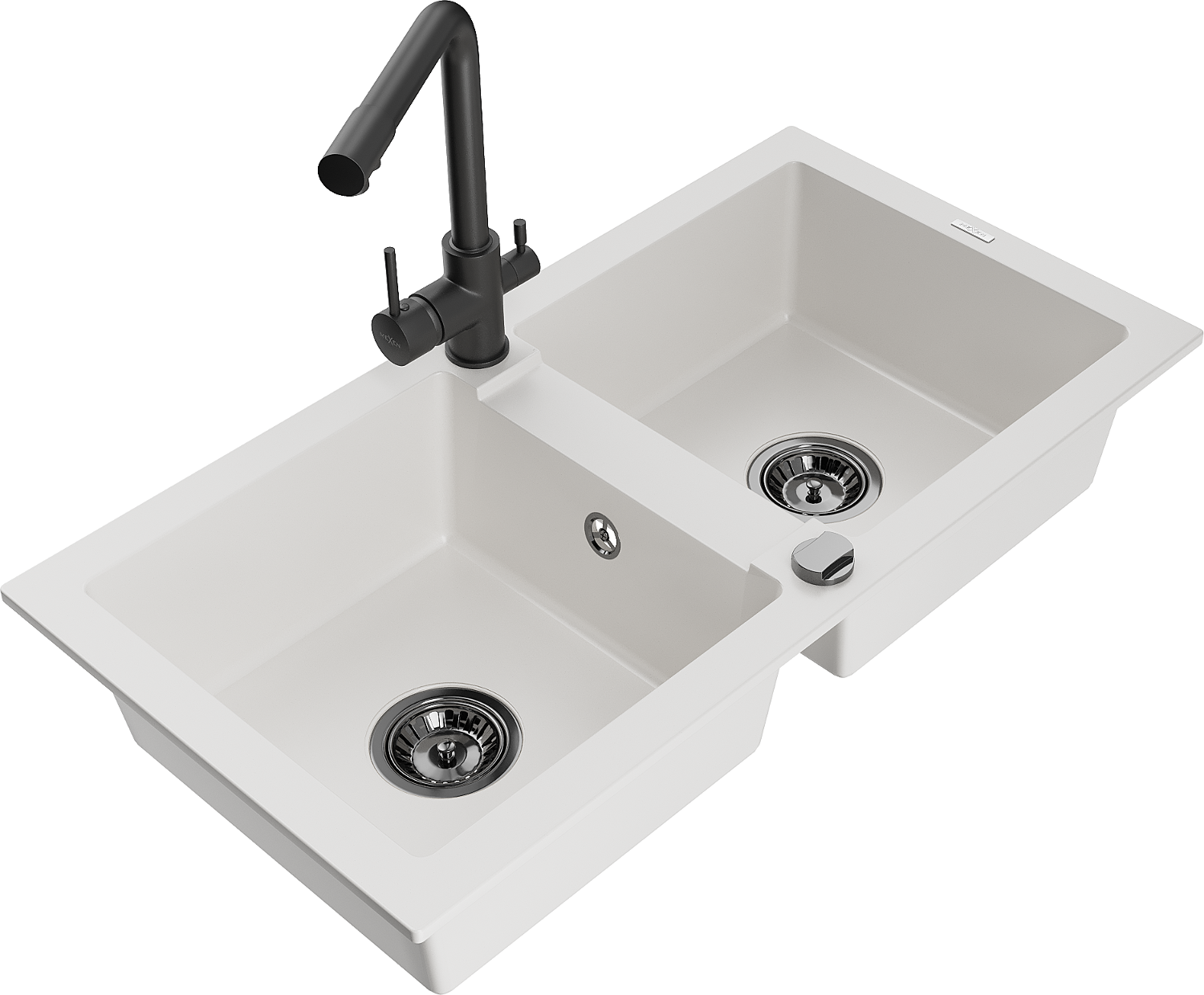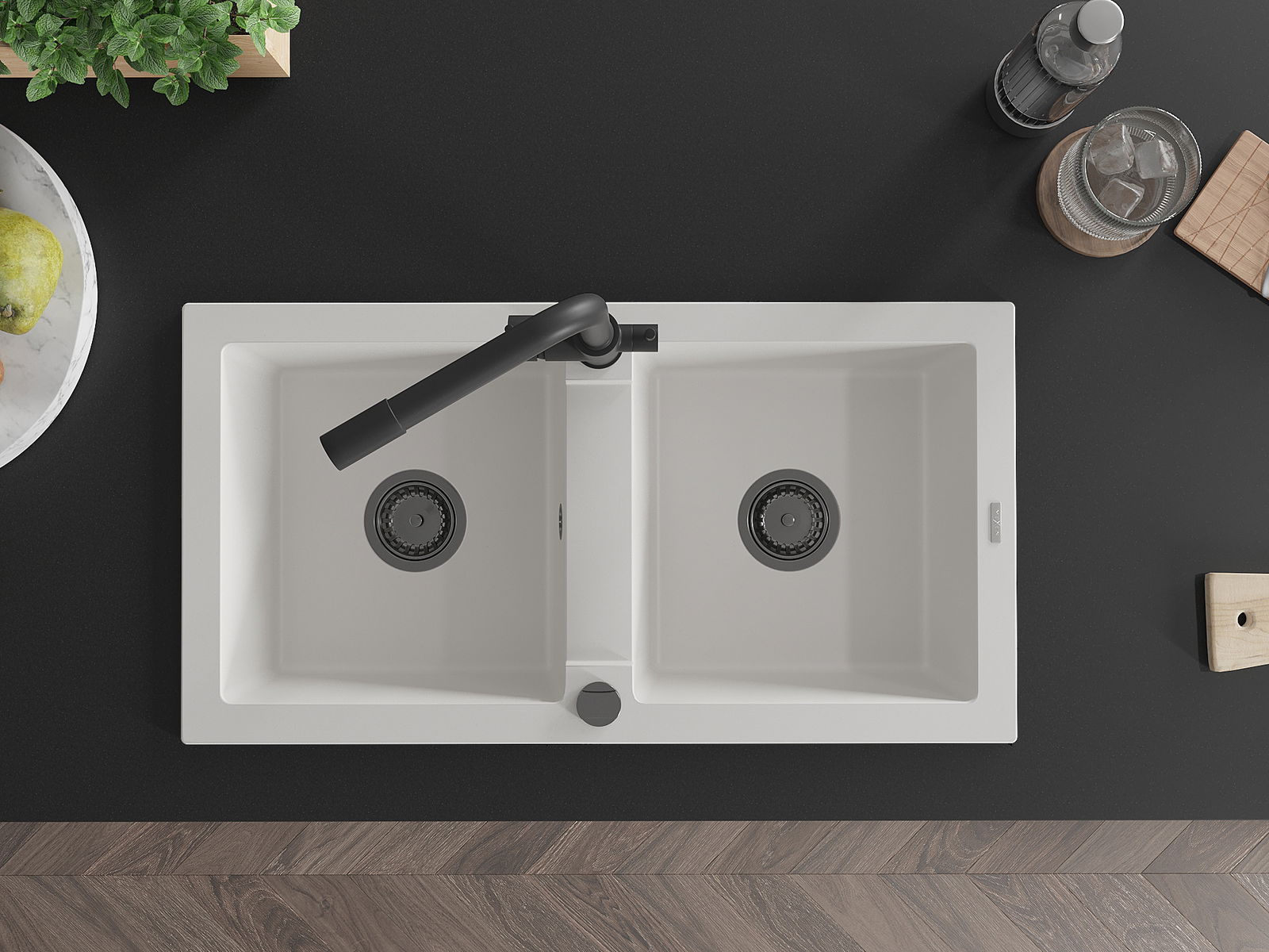Mexen Mario dvoukomorový granitový dřez s kuchyňskou baterií Duero, bílý - 6504-20-671600-70