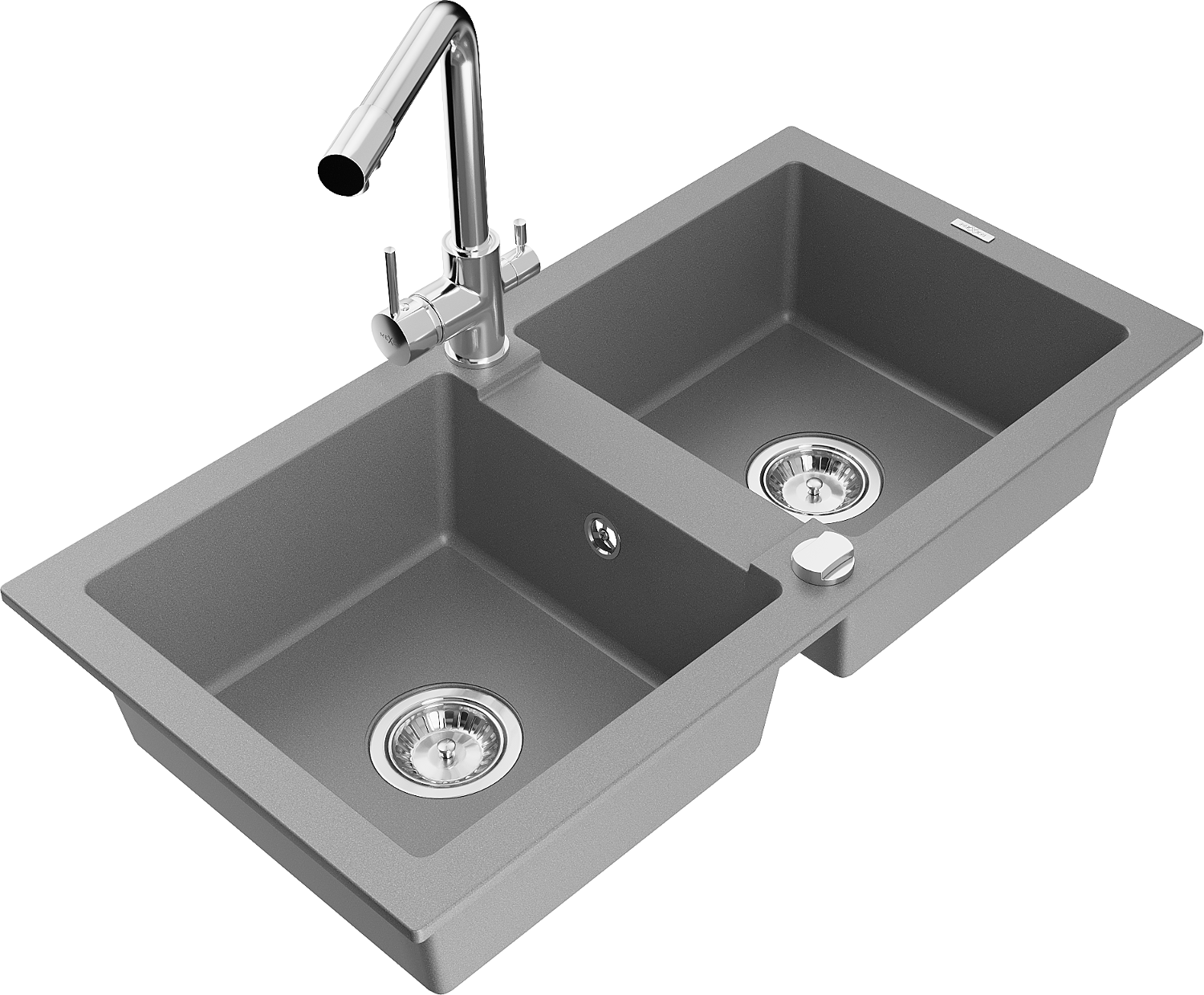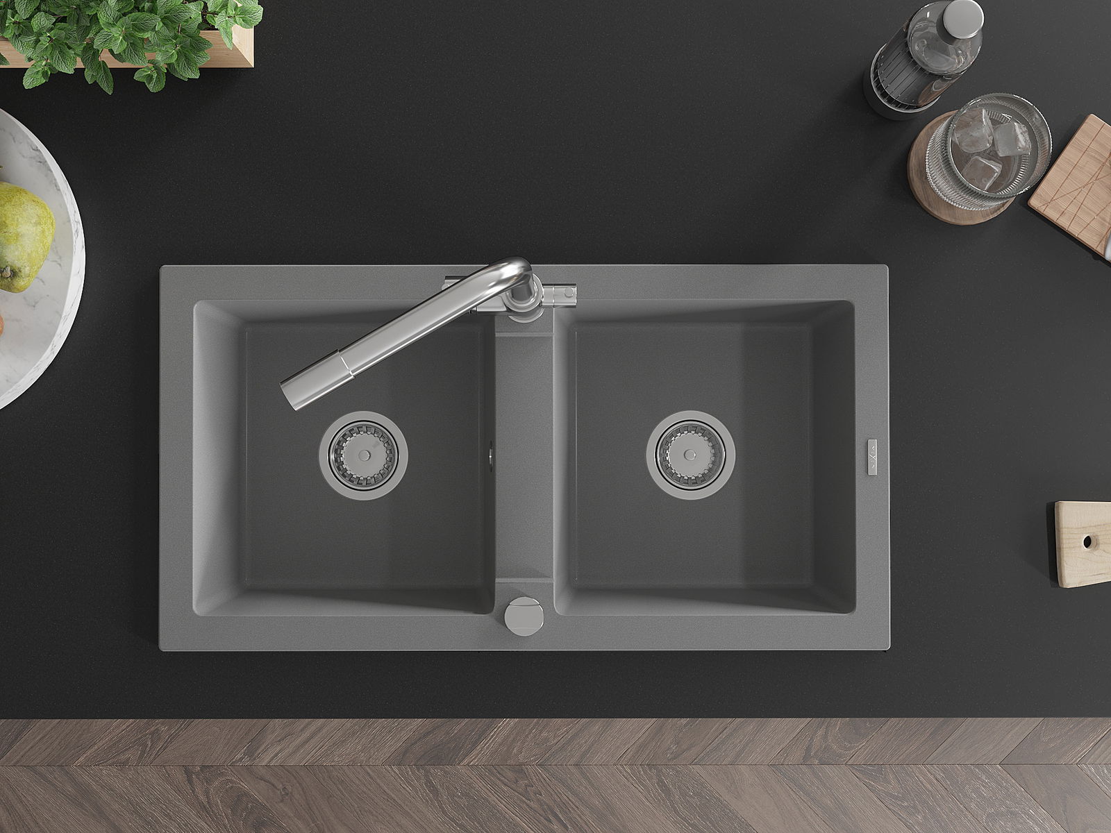 Mexen Mario dvoukomorový granitový dřez s kuchyňskou baterií Duero, šedý - 6504-71-671600-00