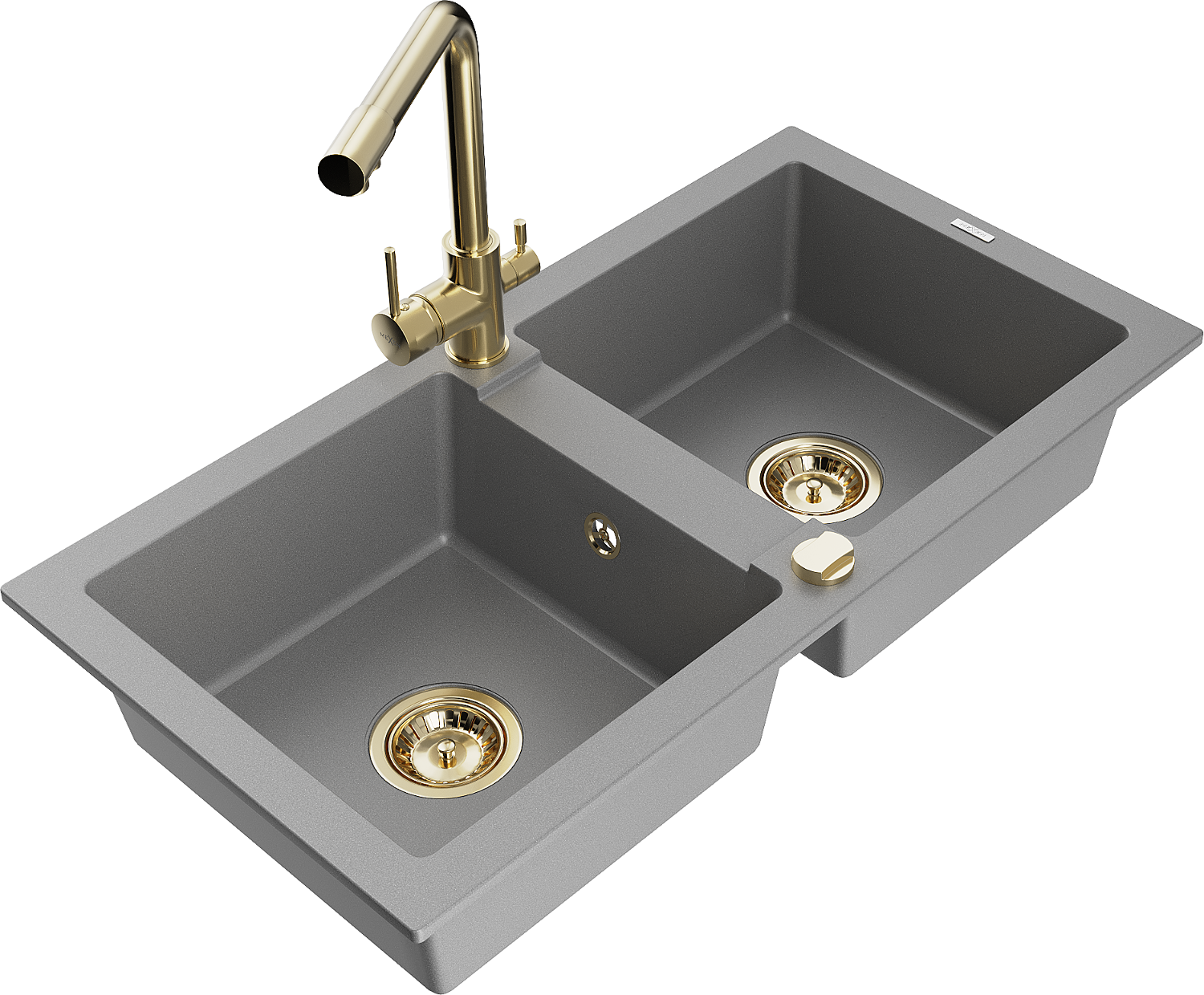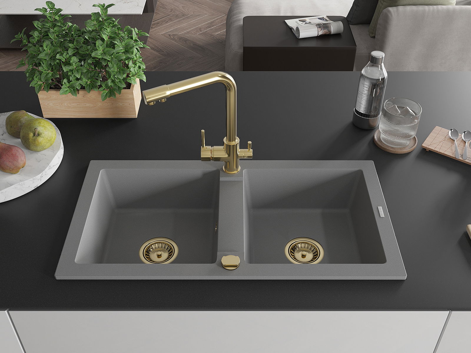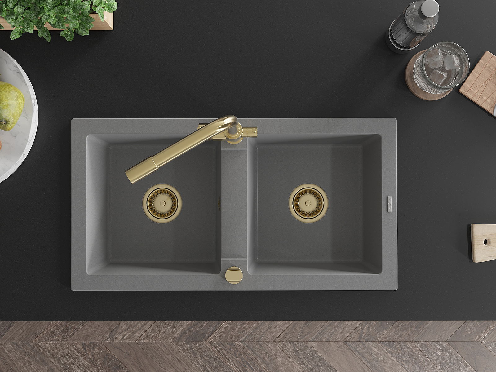 Mexen Mario žulový dřez 2-komorový s kuchyňskou baterií Duero, šedý - 6504-71-671600-50