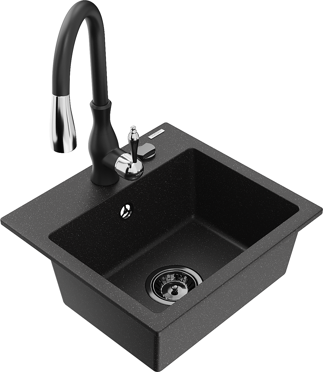 Mexen Milo granitový dřez 1-komorový s kuchyňskou baterií Savita, černý/stříbrný metalik- 6505-73-672601-70-B