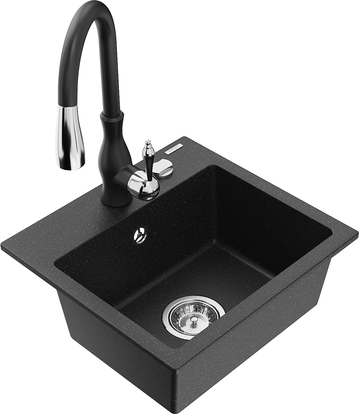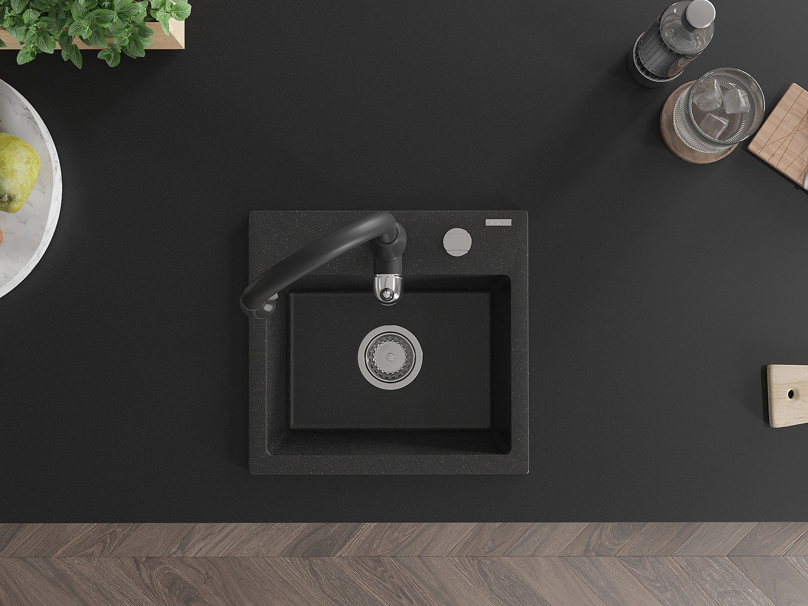 Mexen Milo granitový dřez 1-komorový s kuchyňskou baterií Savita, černý/stříbrný metalik- 6505-73-672601-70
