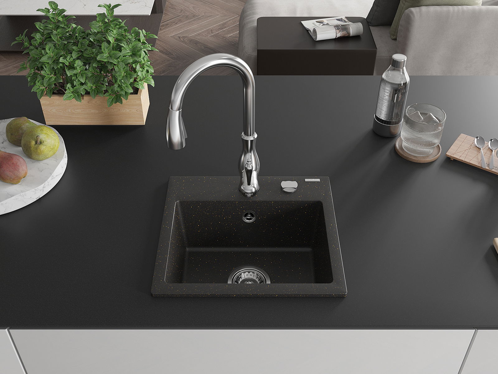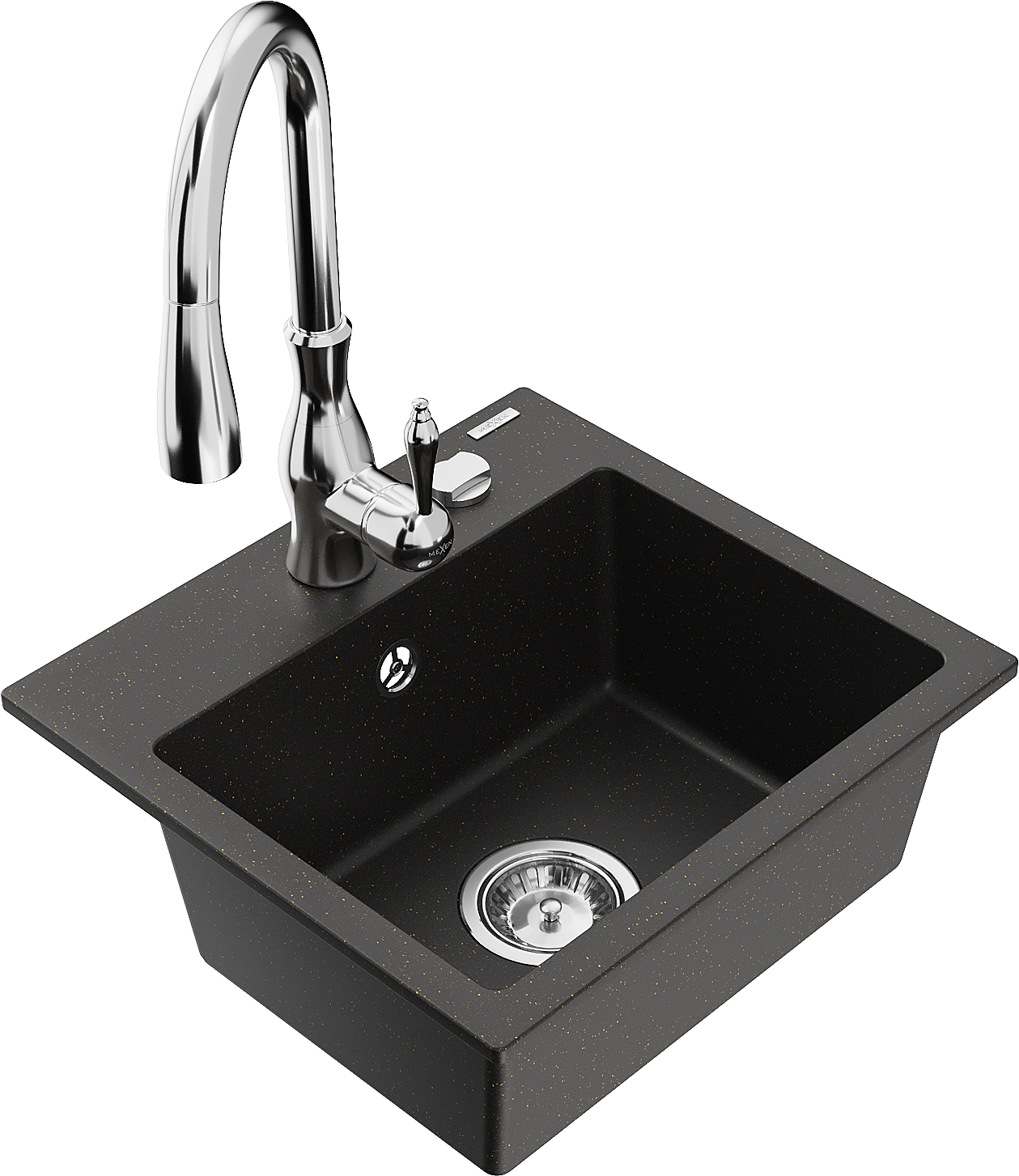 Mexen Milo granitový dřez 1-komorový s kuchyňskou baterií Savita, černý/zlatý metalický- 6505-75-672601-00