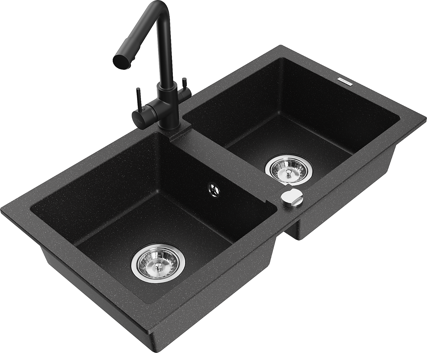 Mexen Mario dřez žulový 2-komorový s kuchyňskou baterií Duero, černý/stříbrný metalik - 6504-73-671600-70