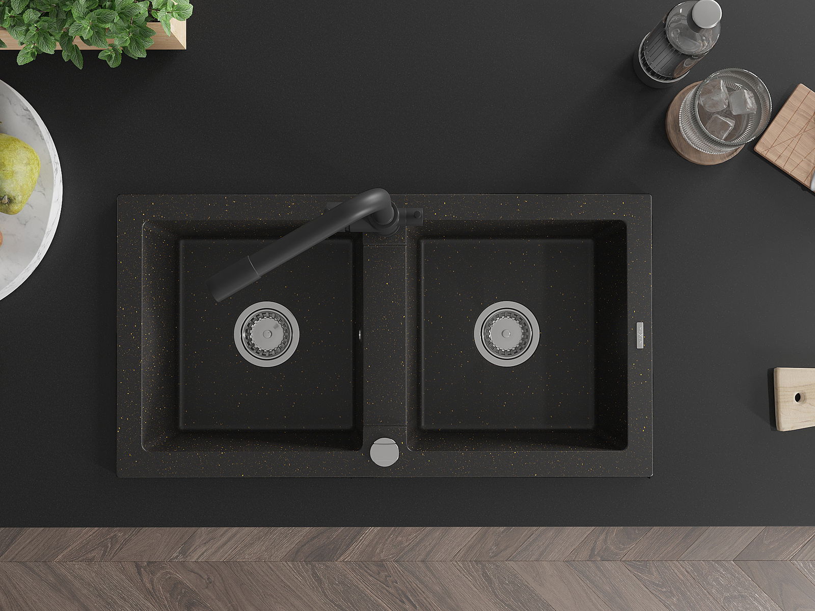 Mexen Mario granitový dřez 2-komorový s kuchyňskou baterií Duero, černý/zlatý metalik - 6504-75-671600-70