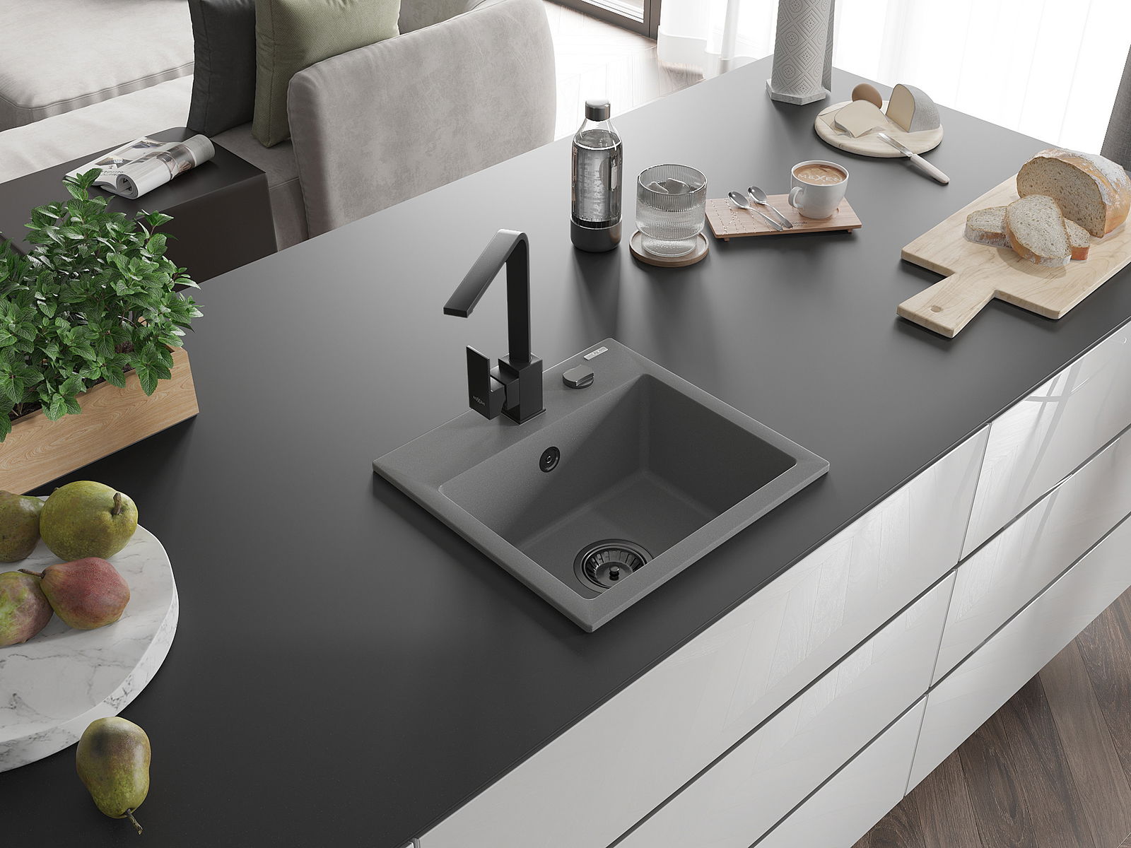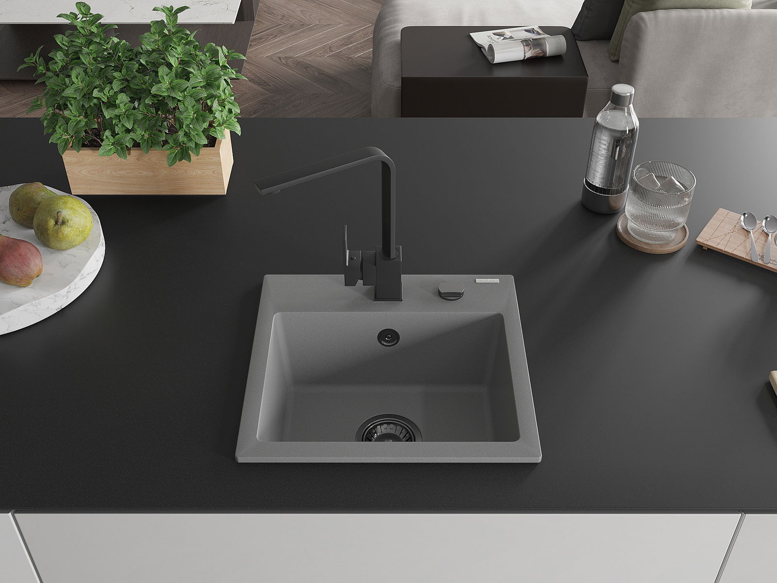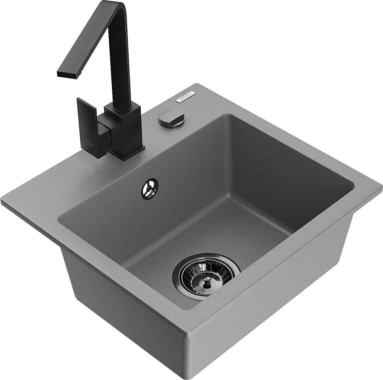 Mexen Milo žulový dřez s 1 komorou a kuchyňskou baterií Rita, šedý - 6505-71-670300-70-B