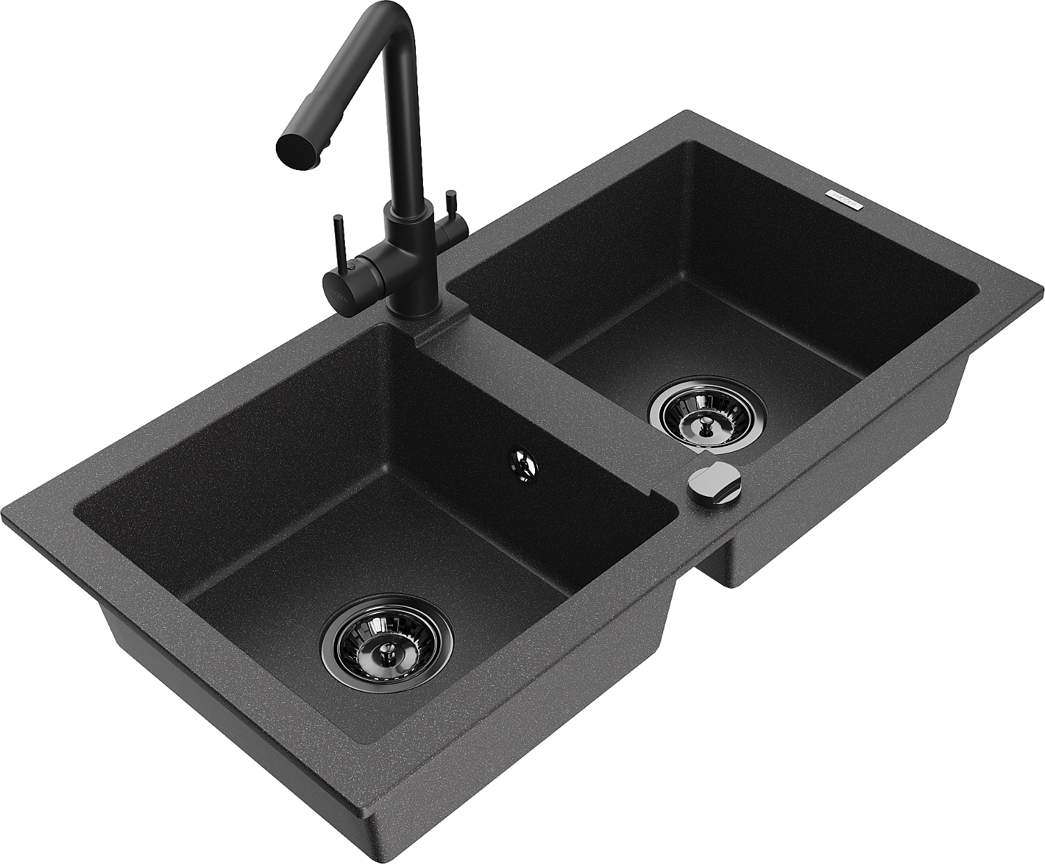 Mexen Mario žulový dřez s 2 komorami a kuchyňskou baterií Duero, černý skvrnitý - 6504-76-671600-70-B