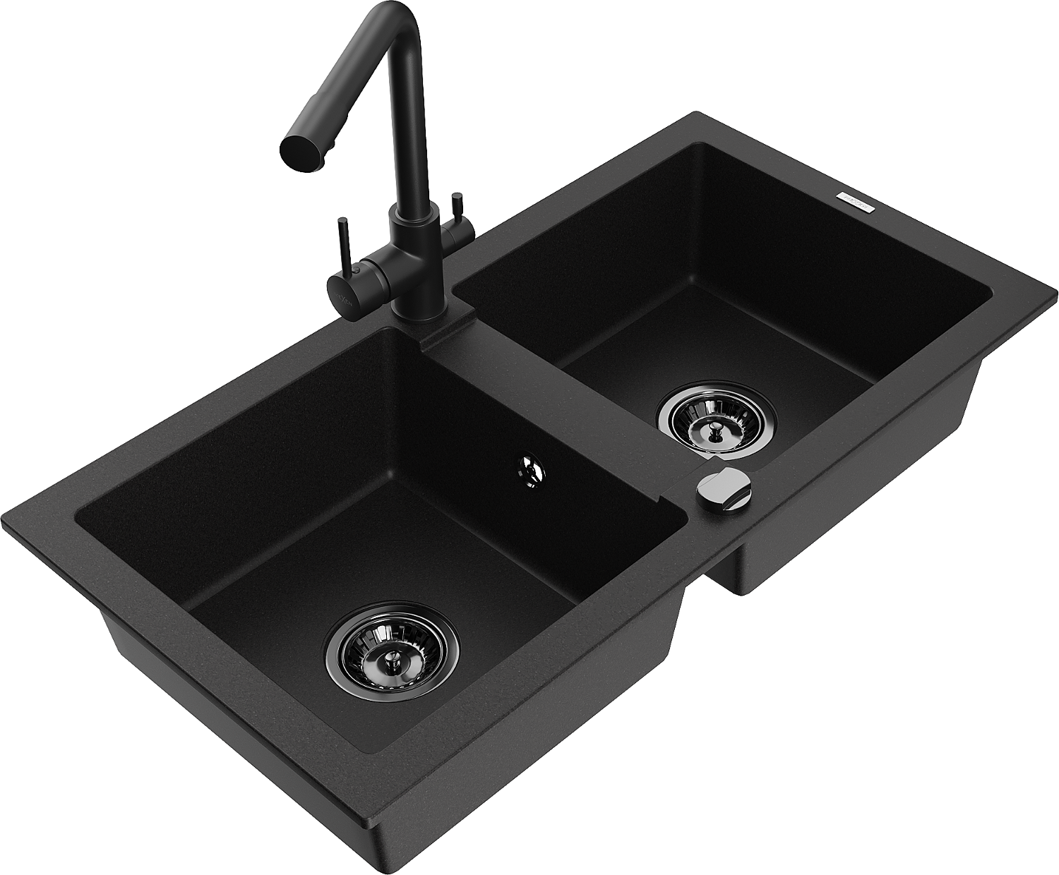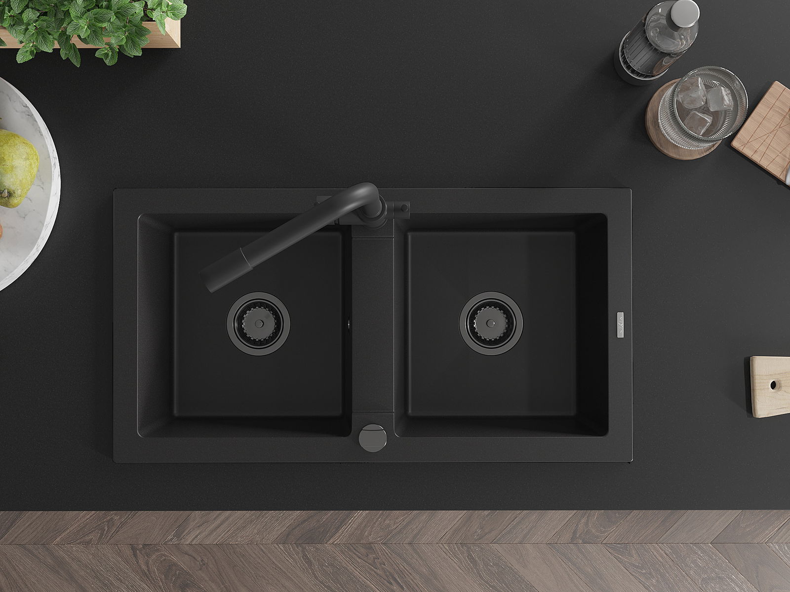 Mexen Mario dřez granitový 2-komorový s kuchyňskou baterií Duero, černý - 6504-77-671600-70-B