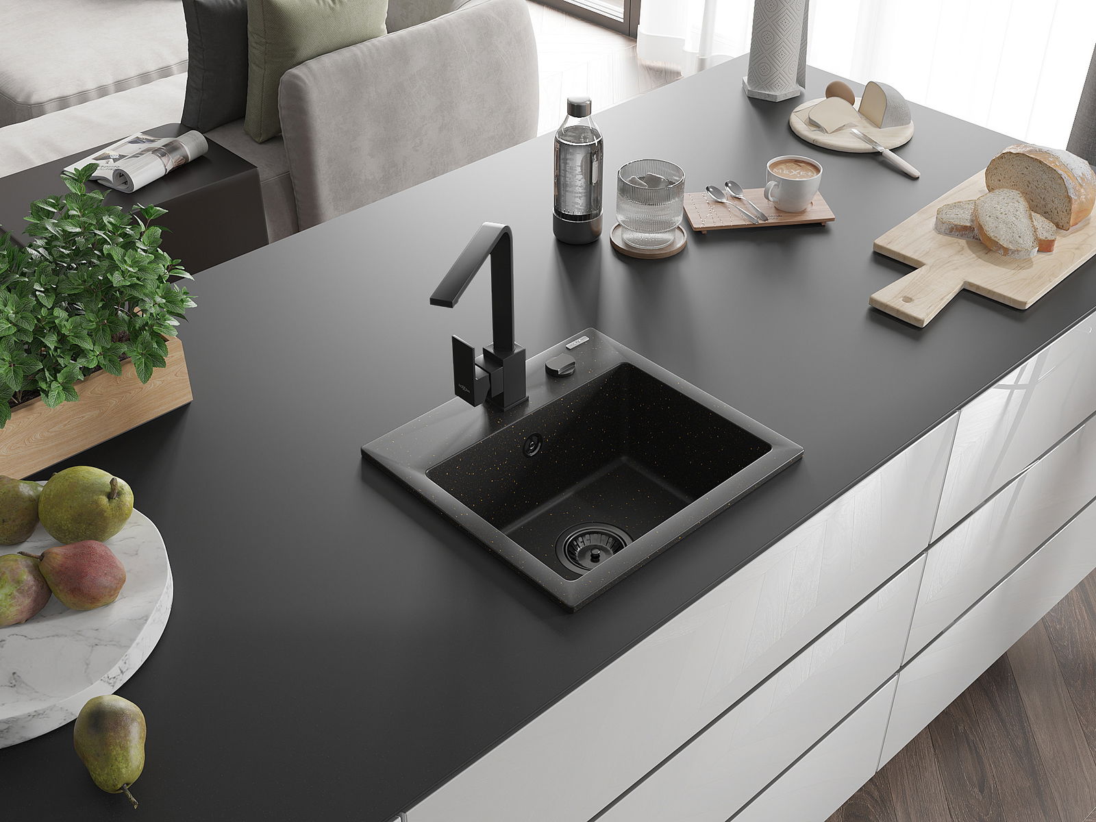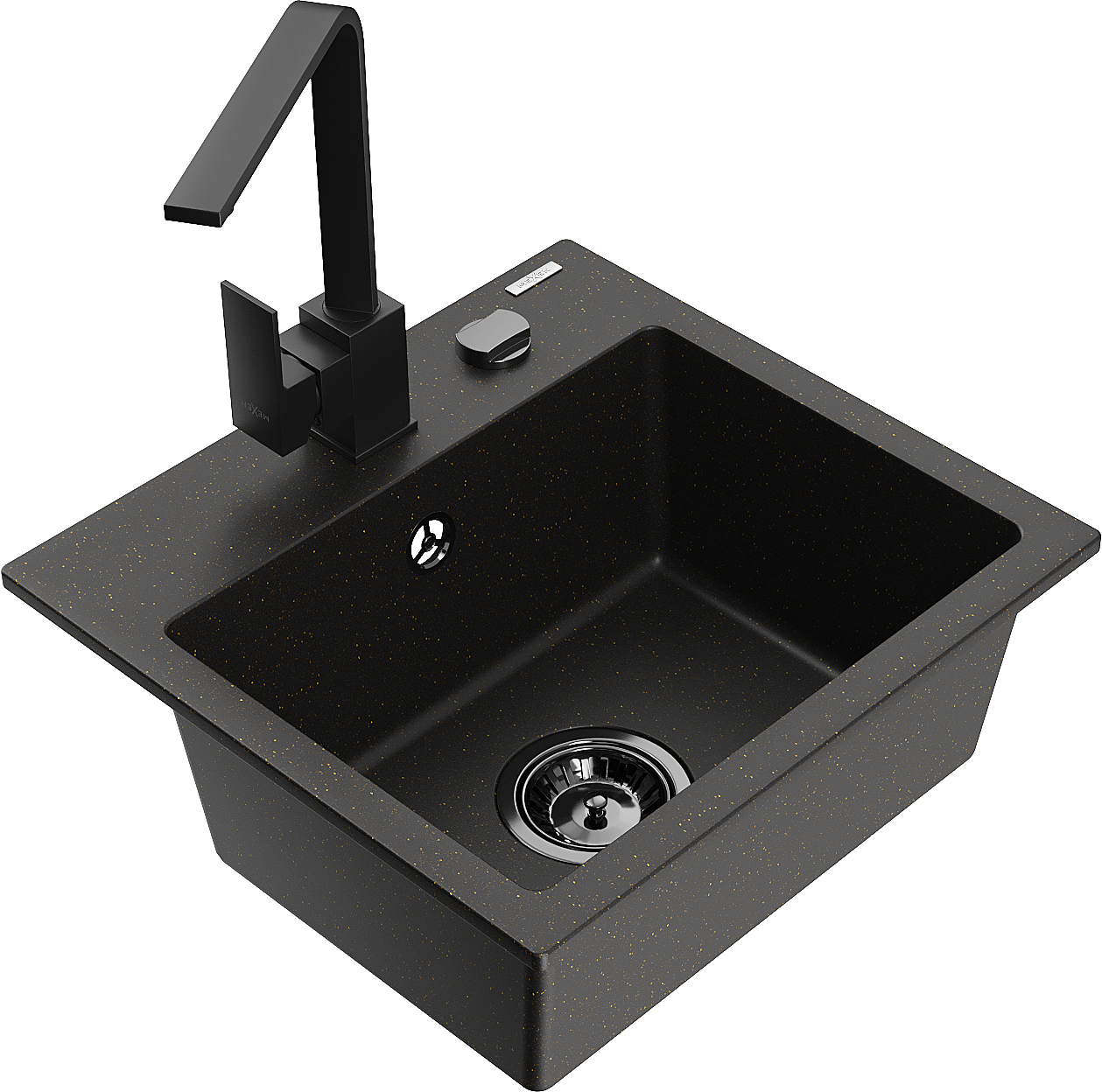 Mexen Milo granitový dřez 1-komorový s kuchyňskou baterií Rita, černý/zlatý metalik - 6505-75-670300-70-B