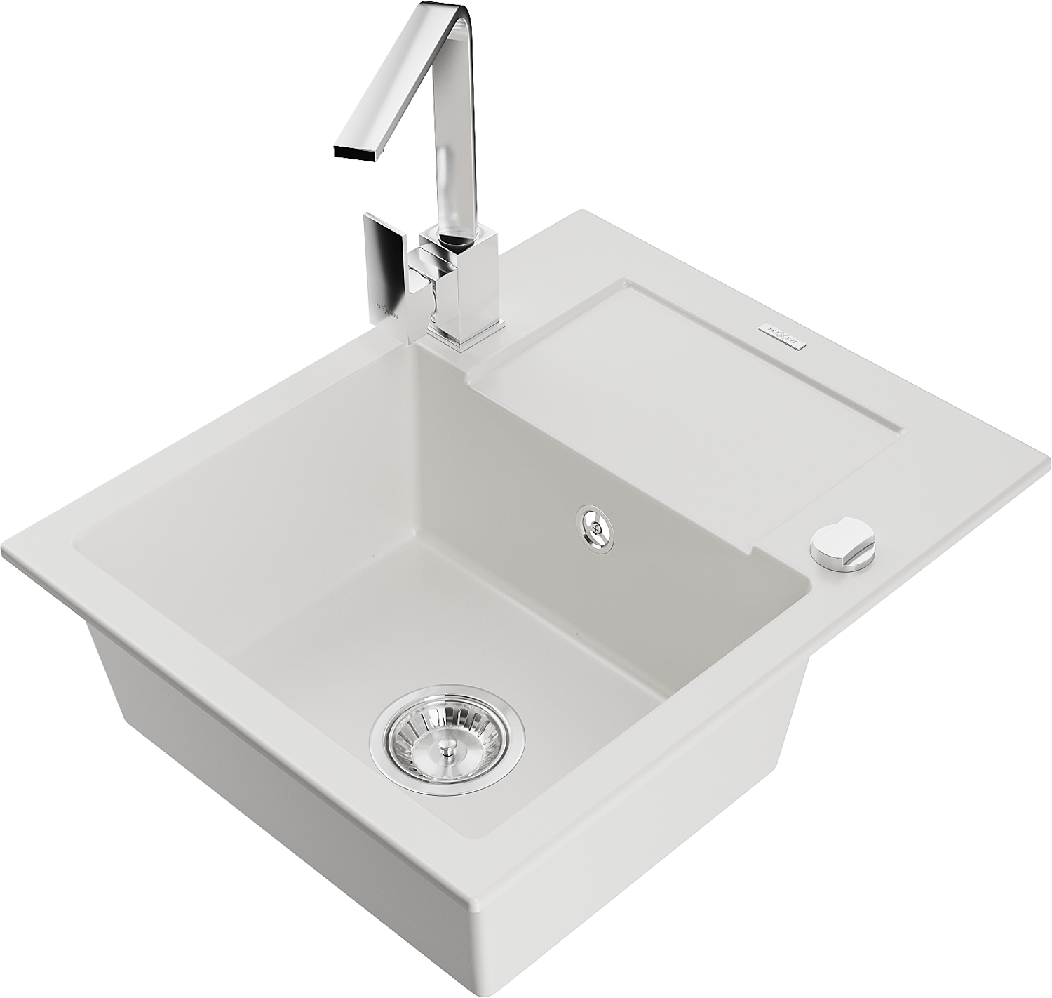 Mexen Enzo granitový kuchyňský dřez 1-komorový s odkapávačem a kuchyňskou baterií Rita, bílý - 6506-20-670300-00