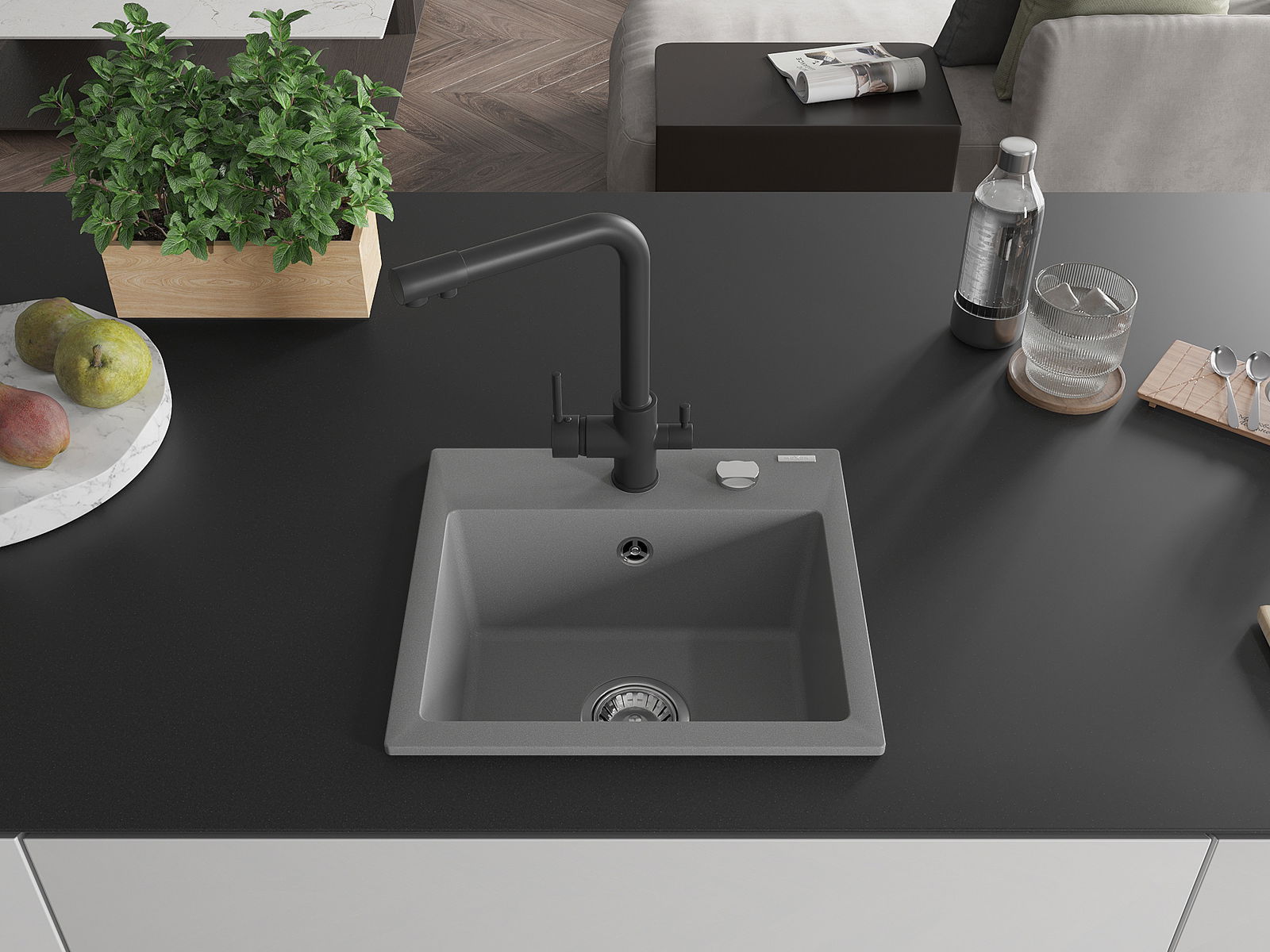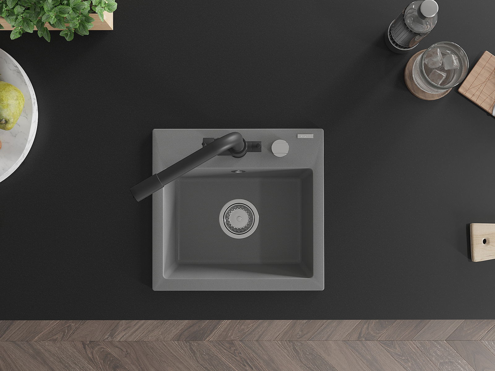 • Mexen Milo granitový dřez 1-komorový s kuchyňskou baterií Duero, šedý - 6505-71-671600-70