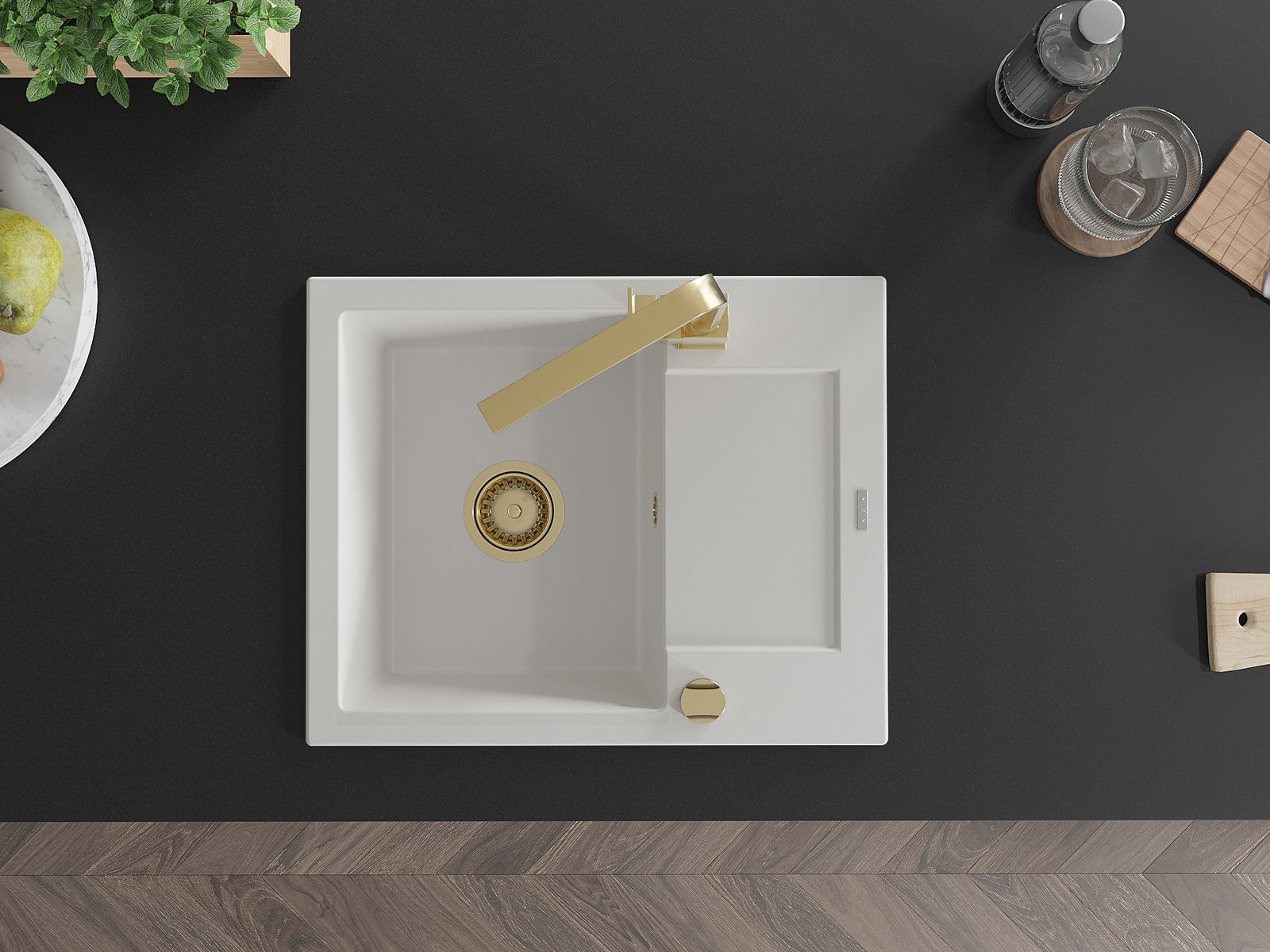 Mexen Enzo granitový dřez s 1 komorou, odkapávačem a kuchyňskou baterií Rita, bílý - 6506-20-670300-50