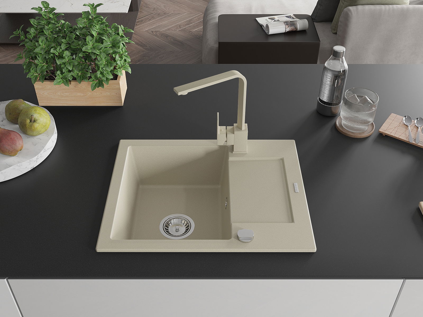 Mexen Enzo granitový dřez s 1 komorou a odkapávačem a kuchyňskou baterií Rita, béžový - 6506-69-670300-69