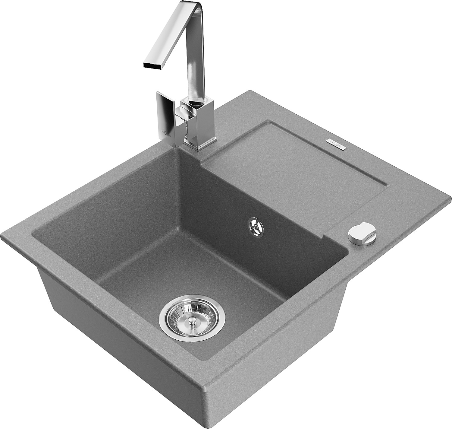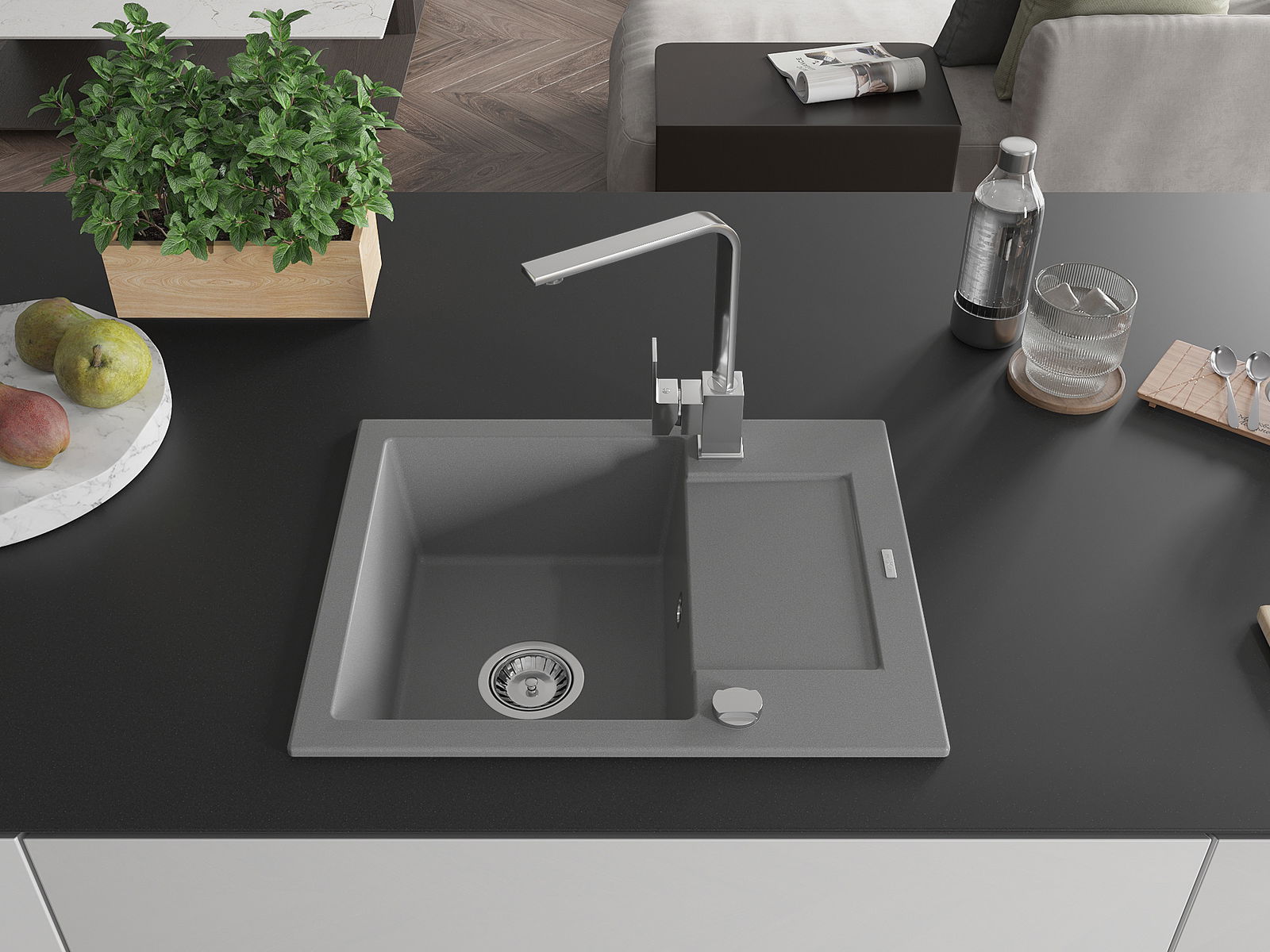 Mexen Enzo granitový dřez 1-komorový s odkapávačem a kuchyňskou baterií Rita, šedý - 6506-71-670300-00