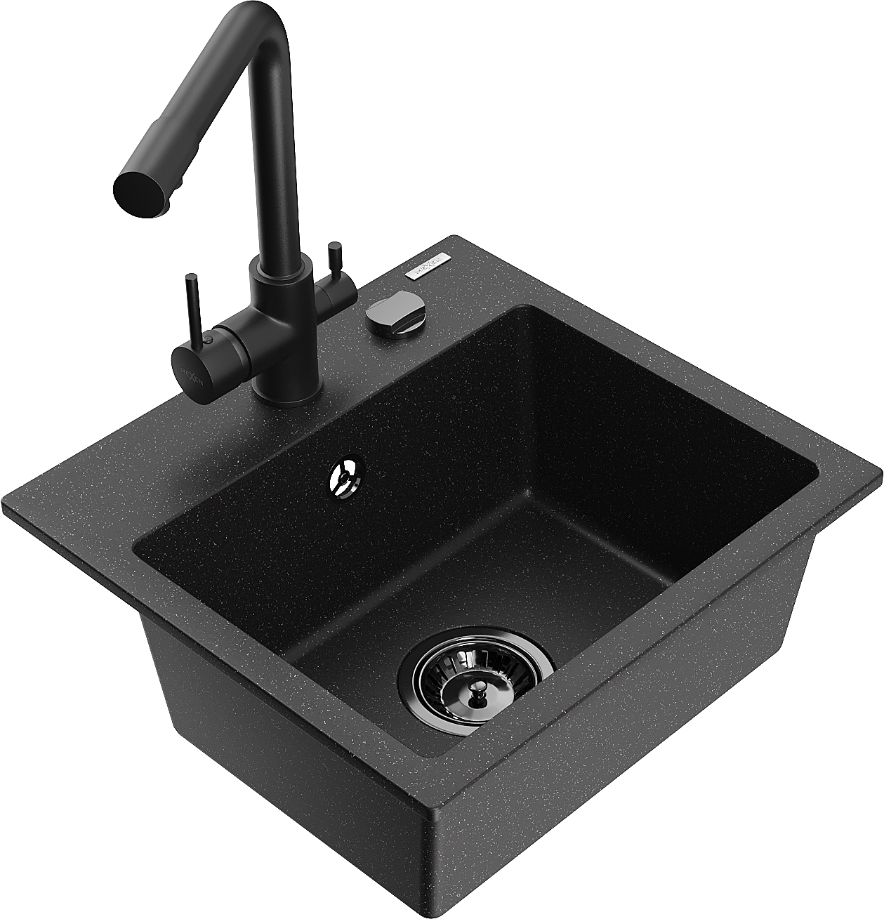 Mexen Milo jednokomorový granitový dřez s kuchyňskou baterií Duero, černý/stříbrný metalický - 6505-73-671600-70-B