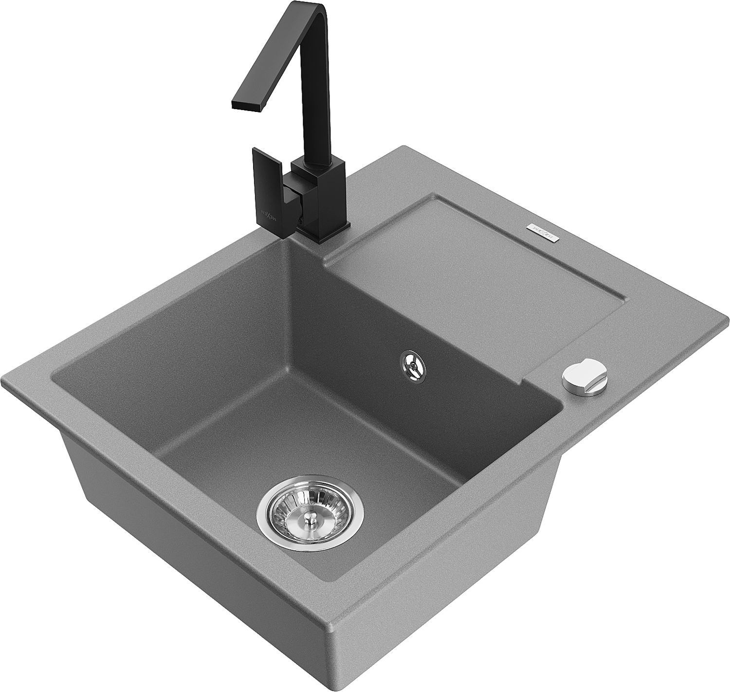 Mexen Enzo granitový dřez 1-komorový s odkapávačem a kuchyňskou baterií Rita, šedý - 6506-71-670300-70