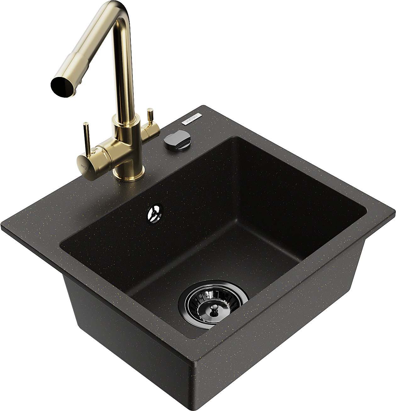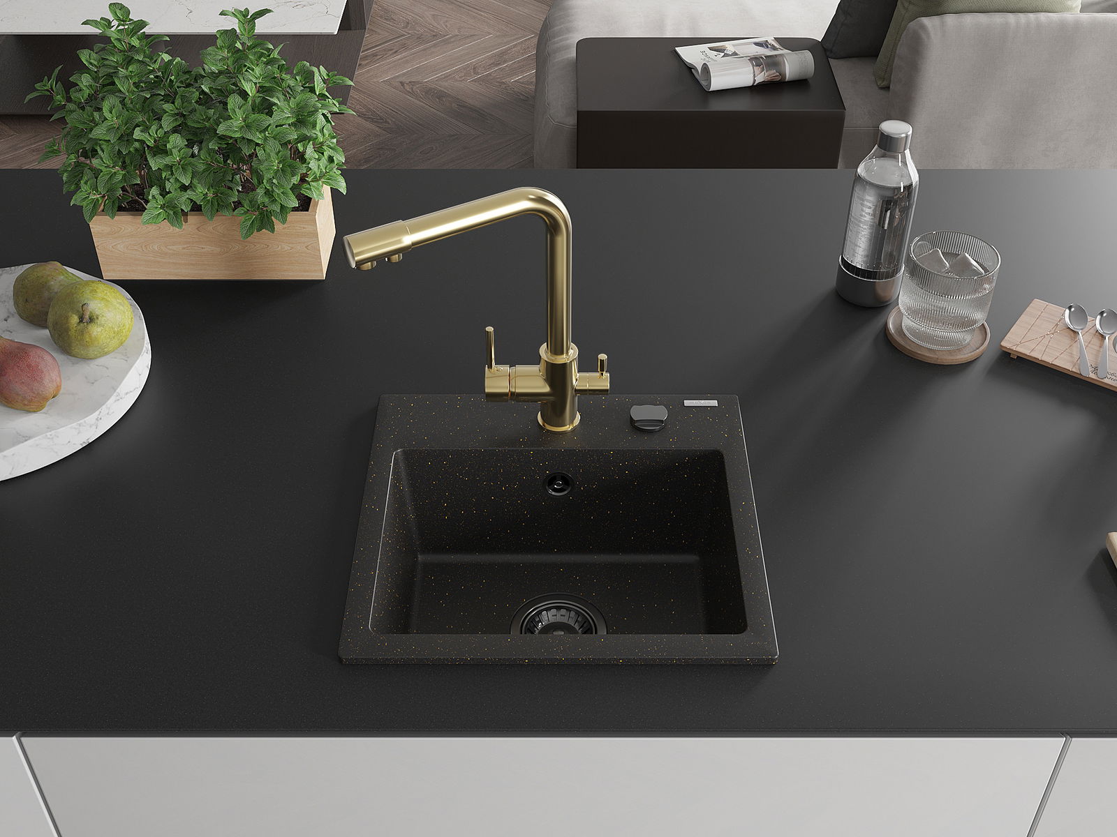 Mexen Milo granitový dřez 1-komorový s kuchyňskou baterií Duero, černý/zlatý metalický - 6505-75-671600-50-B