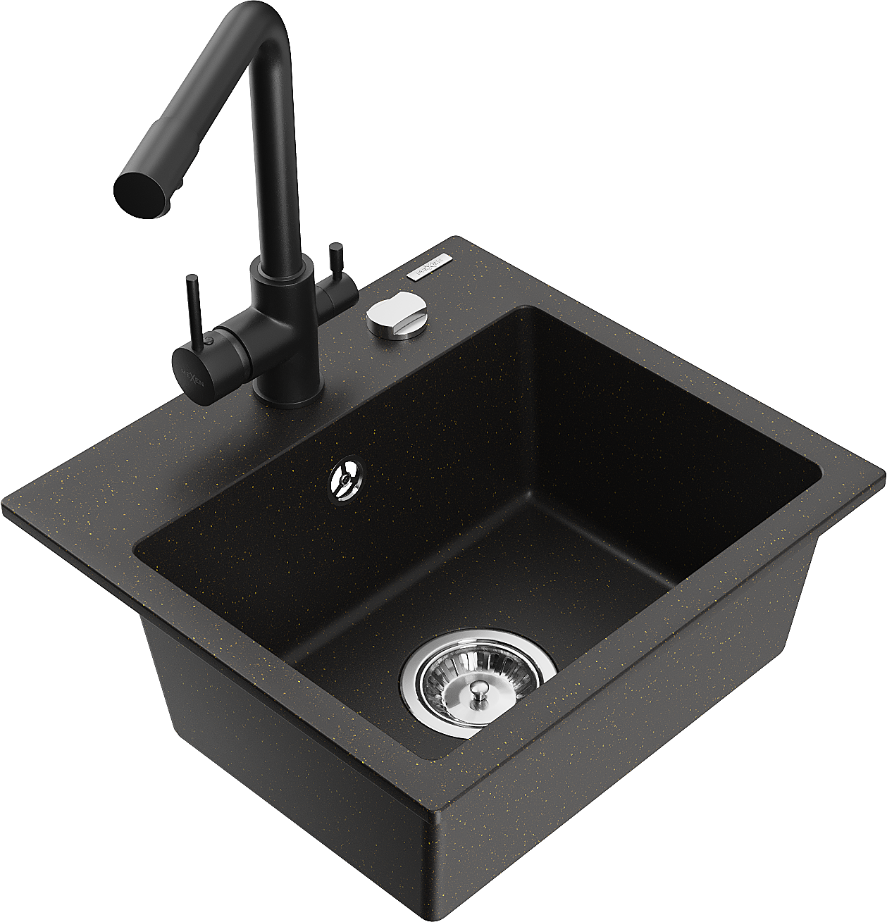 Mexen Milo granitový dřez 1-komorový s kuchyňskou baterií Duero, černý/zlatý metalik - 6505-75-671600-70