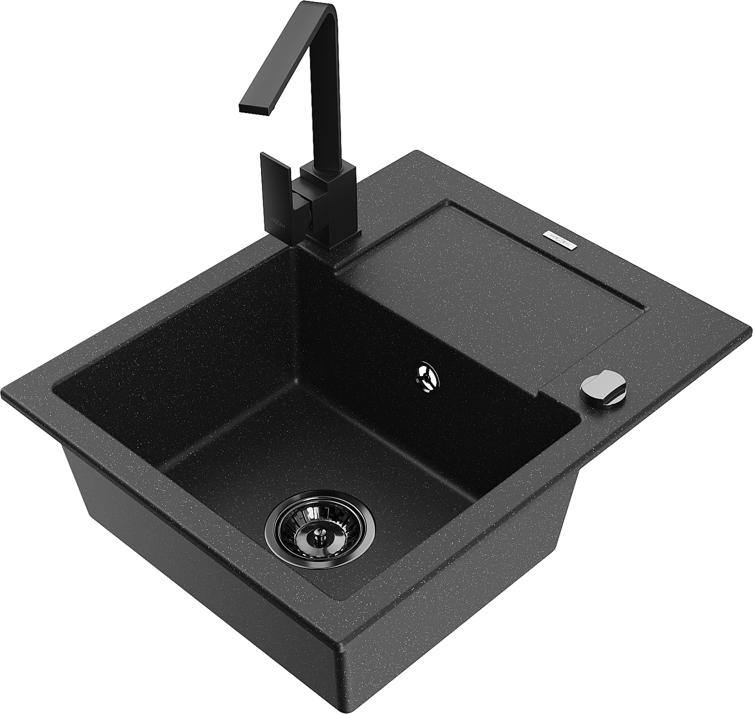 Mexen Enzo granitový dřez jednokomorový s odkapávačem a kuchyňskou baterií Rita, černý/stříbrný metalík - 6506-73-670300-70-B