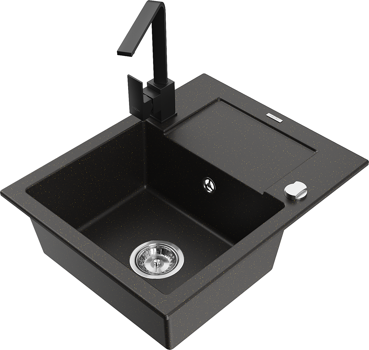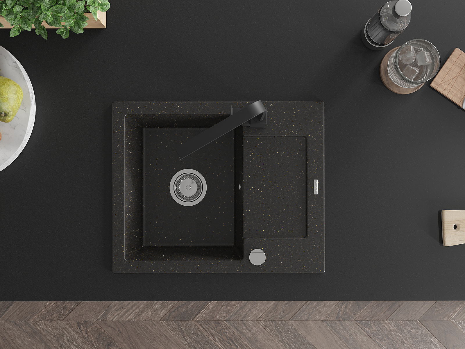Mexen Enzo granitový dřez s 1 komorou, odkapávačem a kuchyňskou baterií Rita, černý/zlatý metalík - 6506-75-670300-70