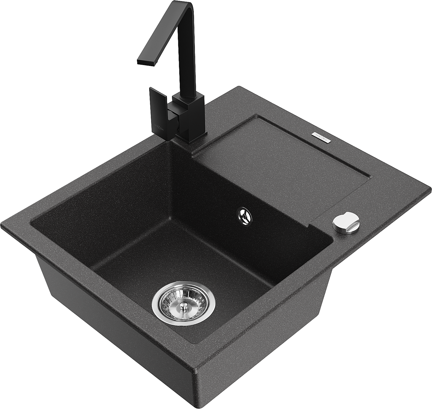 Mexen Enzo granitový dřez 1-komorový s odkapávačem a kuchyňskou baterií Rita, černý skvrnitý - 6506-76-670300-70