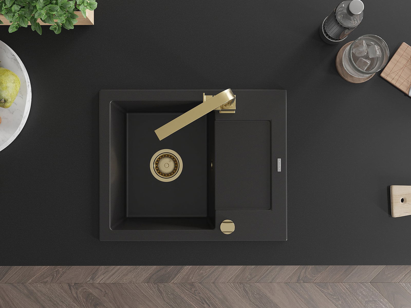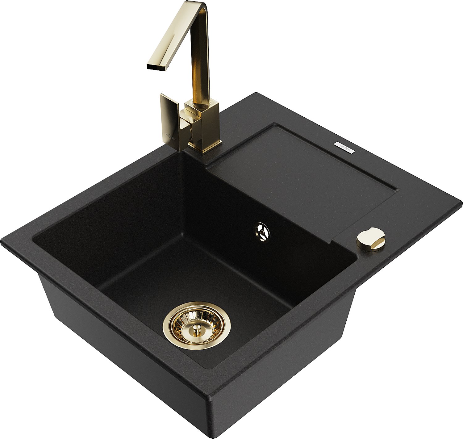 Mexen Enzo granitový dřez 1-komorový s odkapávačem a kuchyňskou baterií Rita, černý - 6506-77-670300-50