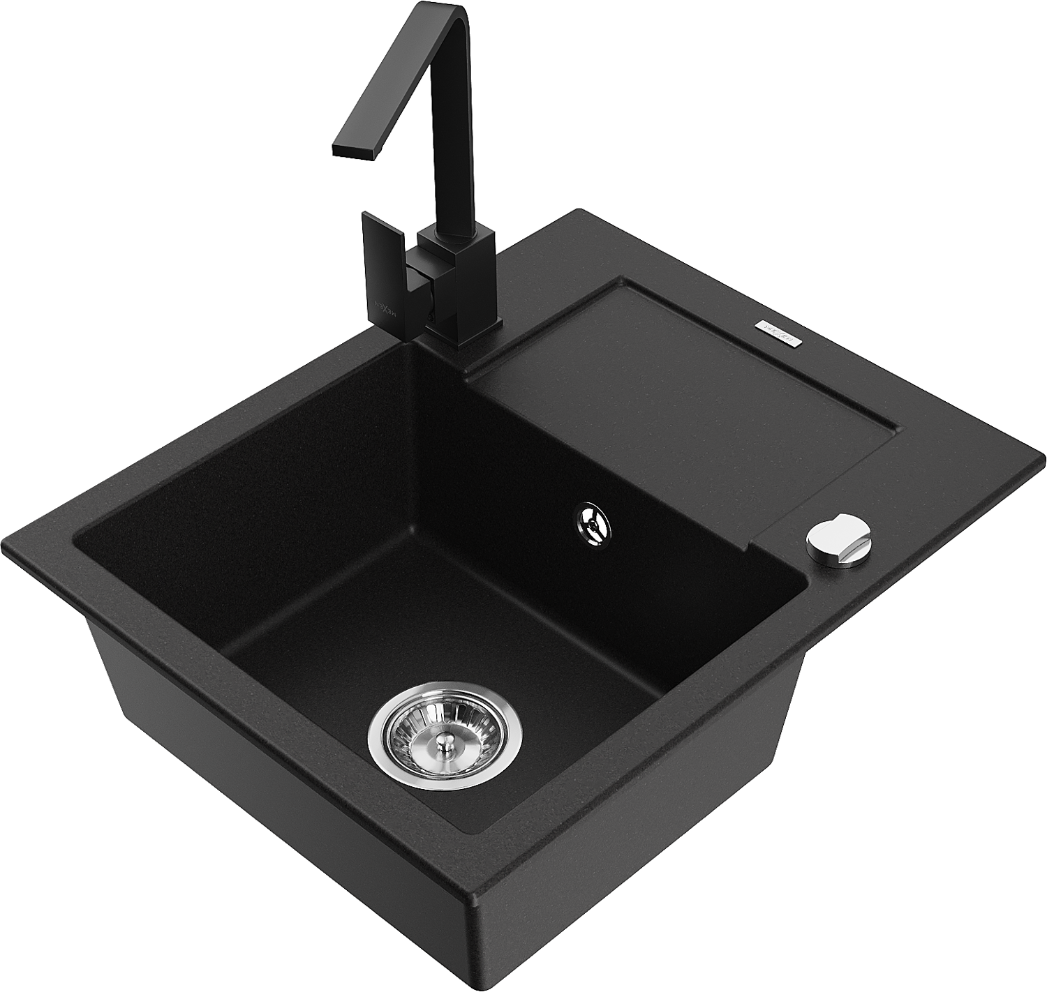 Mexen Enzo granitový dřez 1-komorový s odkapávačem a kuchyňskou baterií Rita, černý - 6506-77-670300-70