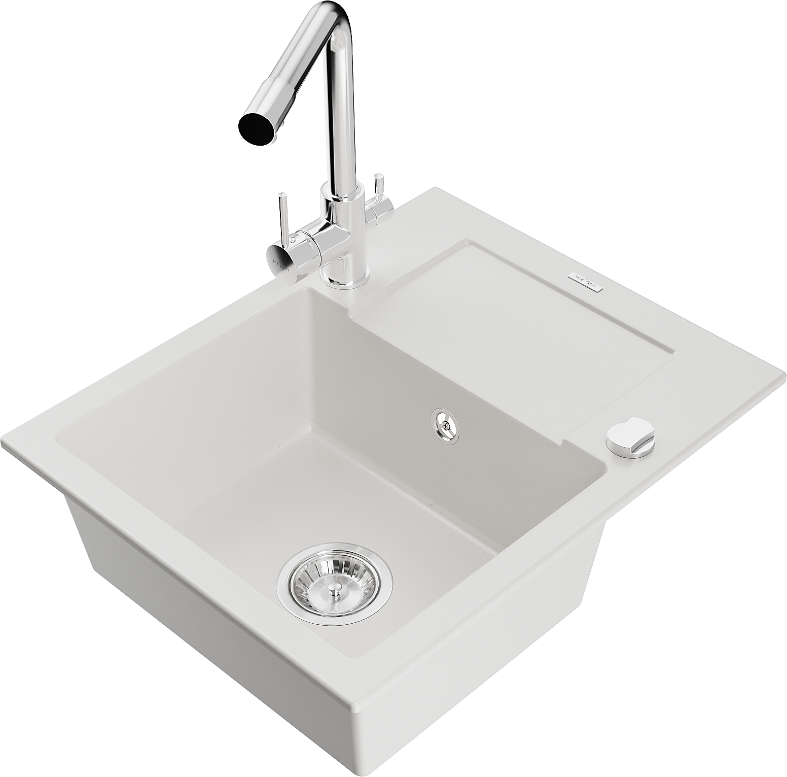 Mexen Enzo granitový dřez 1-komorový s odkapávačem a kuchyňskou baterií Duero, bílý - 6506-20-671600-00