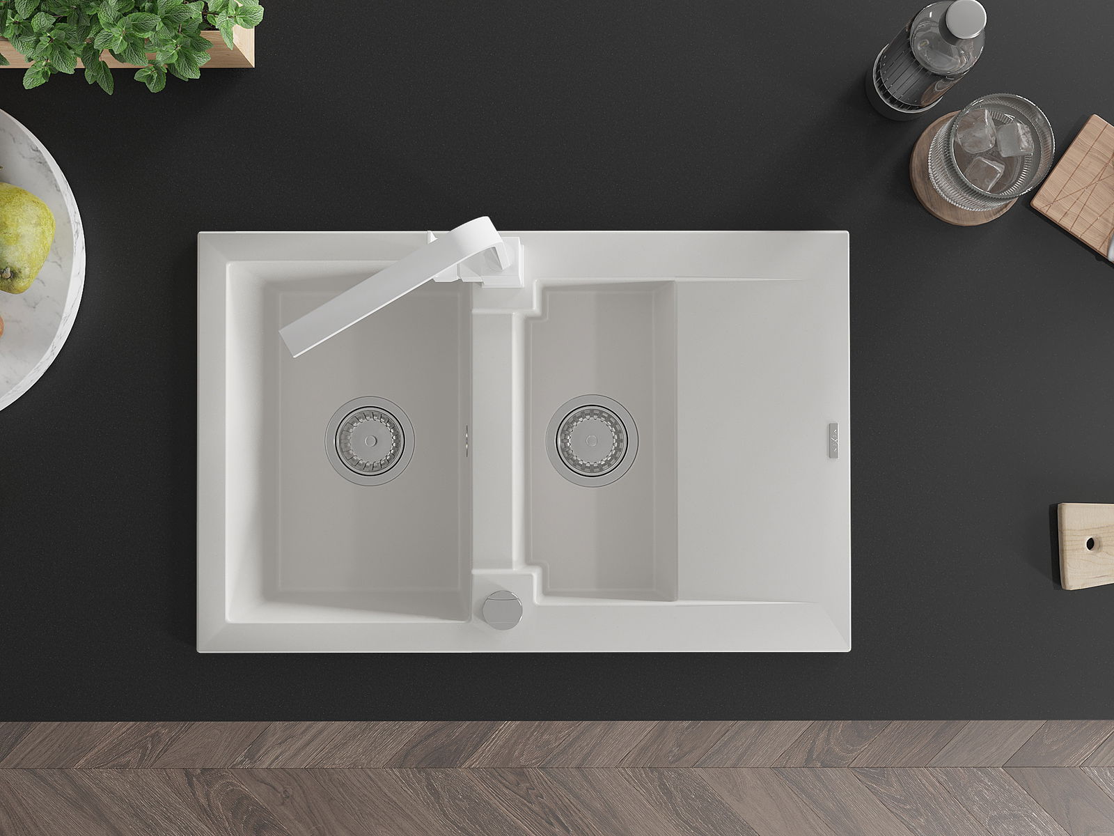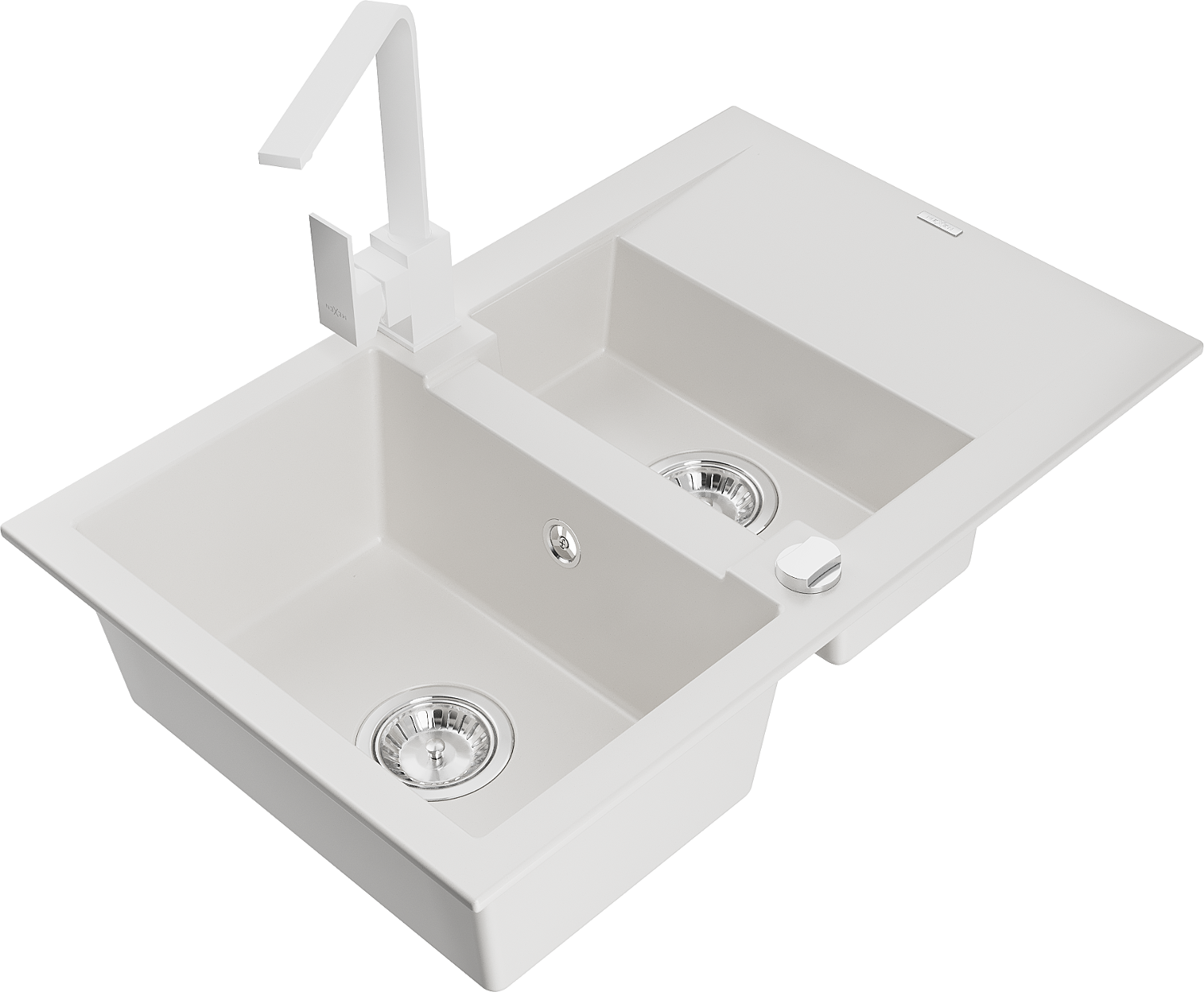 Mexen Gaspar granitový dřez 1,5-komorový s odkapávačem a kuchyňskou baterií Rita, bílý - 6507-20-670300-20
