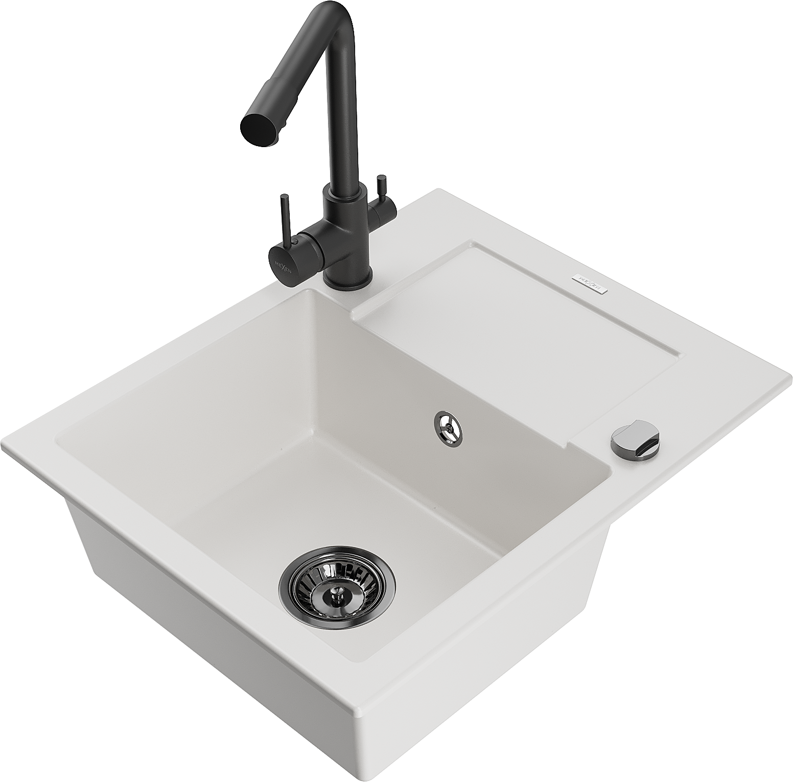 Mexen Enzo granitový dřez s odkapávačem a kuchyňskou baterií Duero, bílá - 6506-20-671600-70